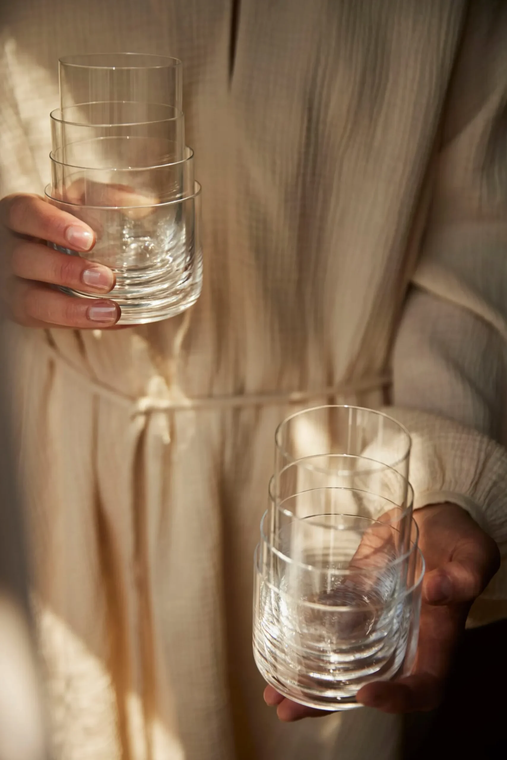 Feines Kristallglas in vier verschiedenen Größen und Formen im Set: Die Trinkgläser NESTING sind volumengleich, fügen sich als Stapel ineinander und lassen sich platzsparend verstauen. Für Wasser, Saft oder Cocktail. Spülmaschinengeeignet und in Form und Material ideal passend zur gleichnamigen Karaffe.