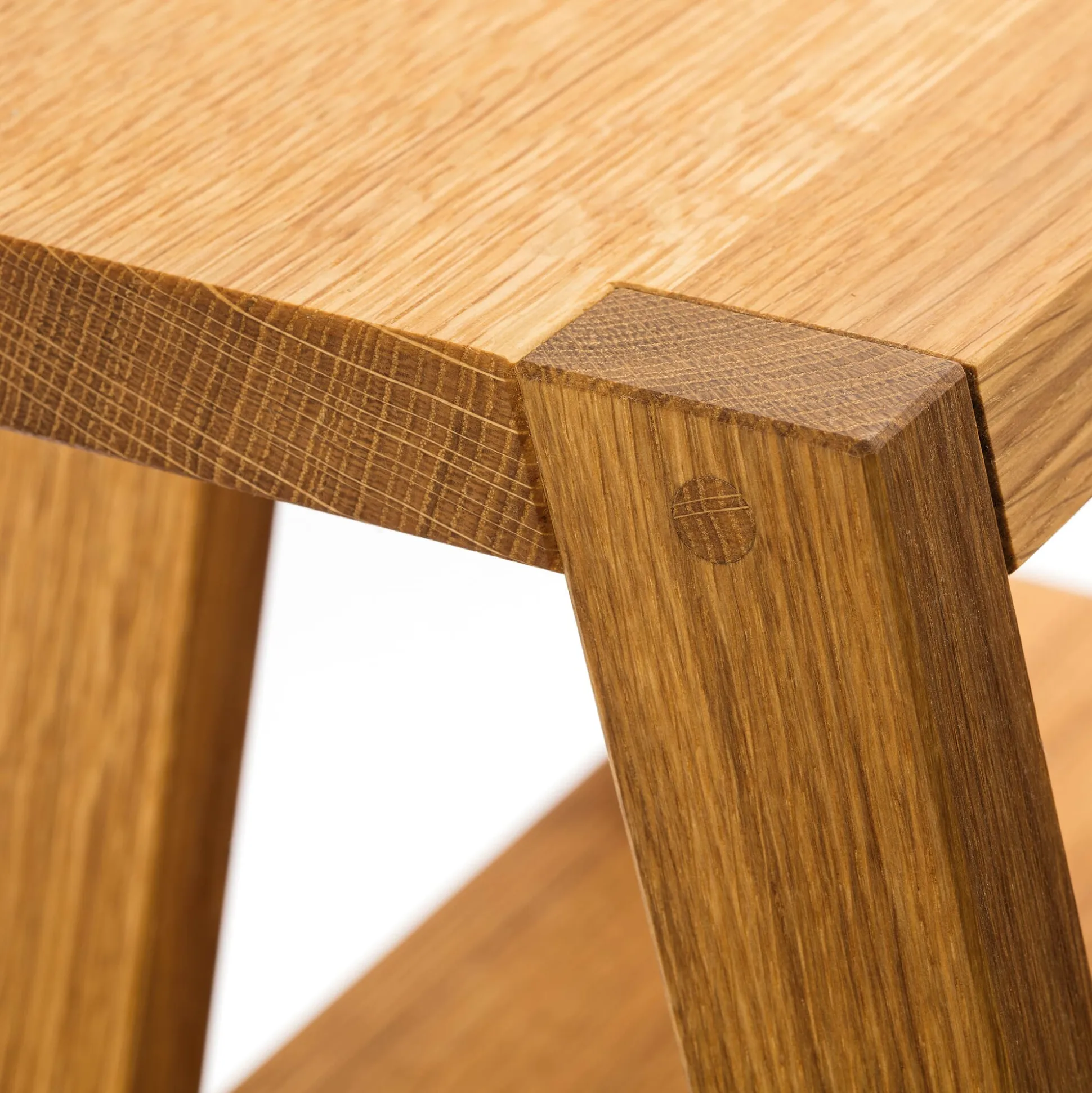 Gefertigt wird der Tritthocker in Deutschland – aus süddeutschem, geöltem Eichen- beziehungsweise mattschwarz lackiertem Eschenholz.