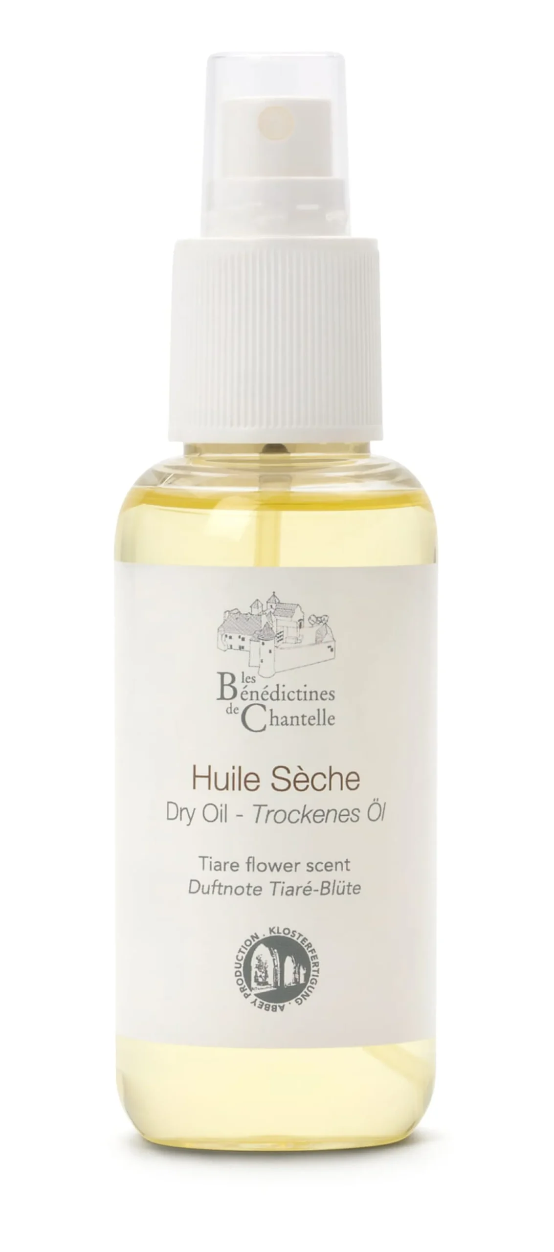Mit seinem hohen Anteil an pflanzlichen Ölen (aus Traubenkernen, Mandeln, Aprikosen, Lilien, Ringelblumen und Johanniskraut) gewährleistet dieses „trockene Öl“ eine sanfte Hautpflege für den ganzen Körper. „Trocken“ wird es genannt, weil es aufgrund seiner Zusammensetzung sehr schnell in die Haut einzieht. Außerdem wirkt zugesetztes Vitamin E als Radikalfänger hautschützend. Die Flasche ist mit einem Zerstäuber zur feinen Dosierung versehen.
