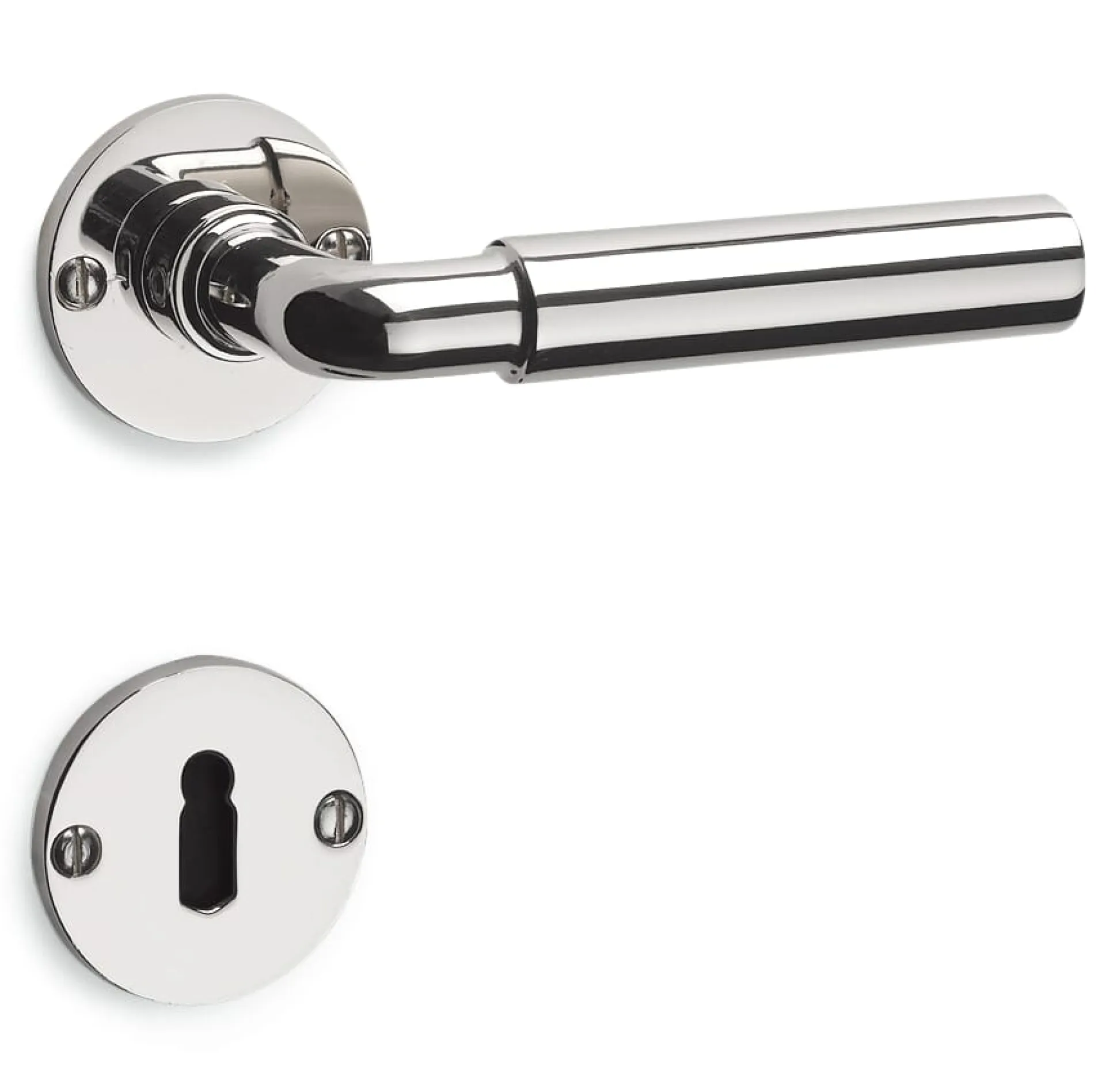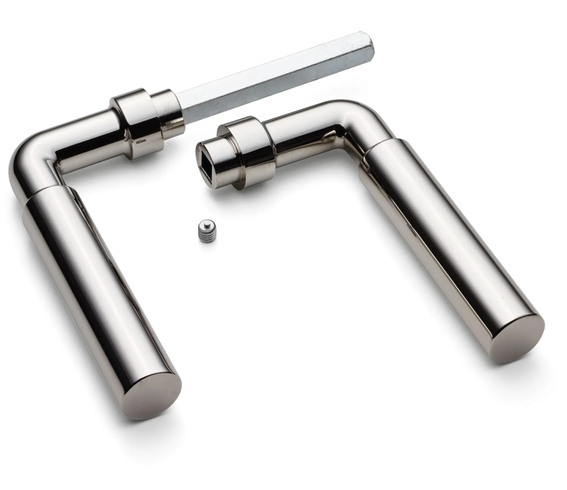 Zinkdruckguss, galvanisch vernickelt und poliert. Grifflänge 12,5 cm, 2 cm Ø. Gesamtgewicht 558 g. Hergestellt in der Schweiz. Zur Verwendung mit den passenden Langschildern oder Rosetten (nicht im Lieferumfang enthalten). Lieferung ohne Schrauben.