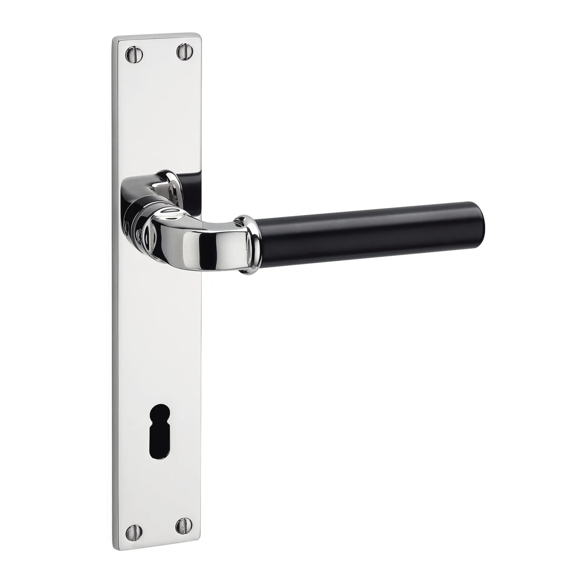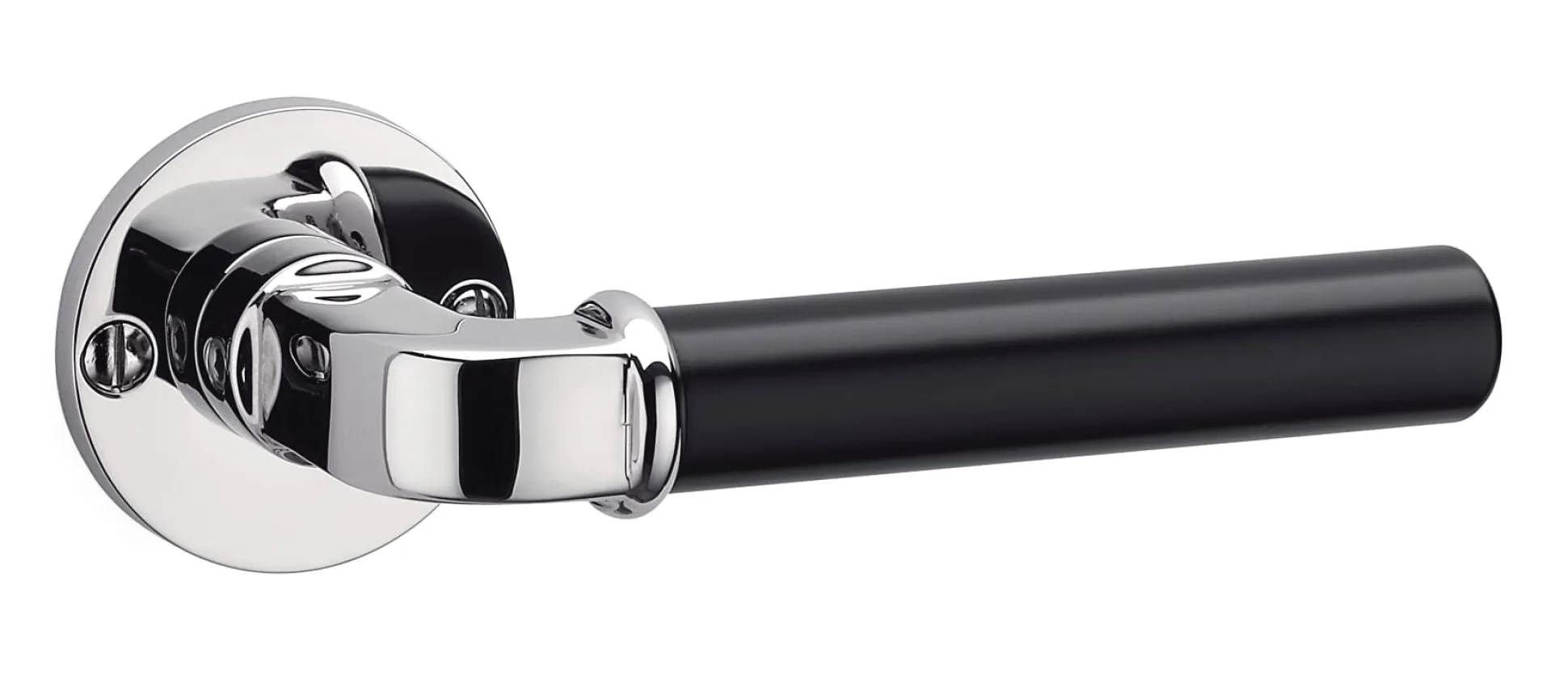 2 Türklinken aus Zinkdruckguss, vernickelt und poliert. Griffstück schwarz lackiert. Grifflänge 11,5 cm, 2 cm Ø. Gewicht eines Griffs 190 g. Zu verwenden mit den passenden Langschildern oder Rosetten (welche nicht in der Lieferung enthalten sind). Lieferung ohne Schrauben.