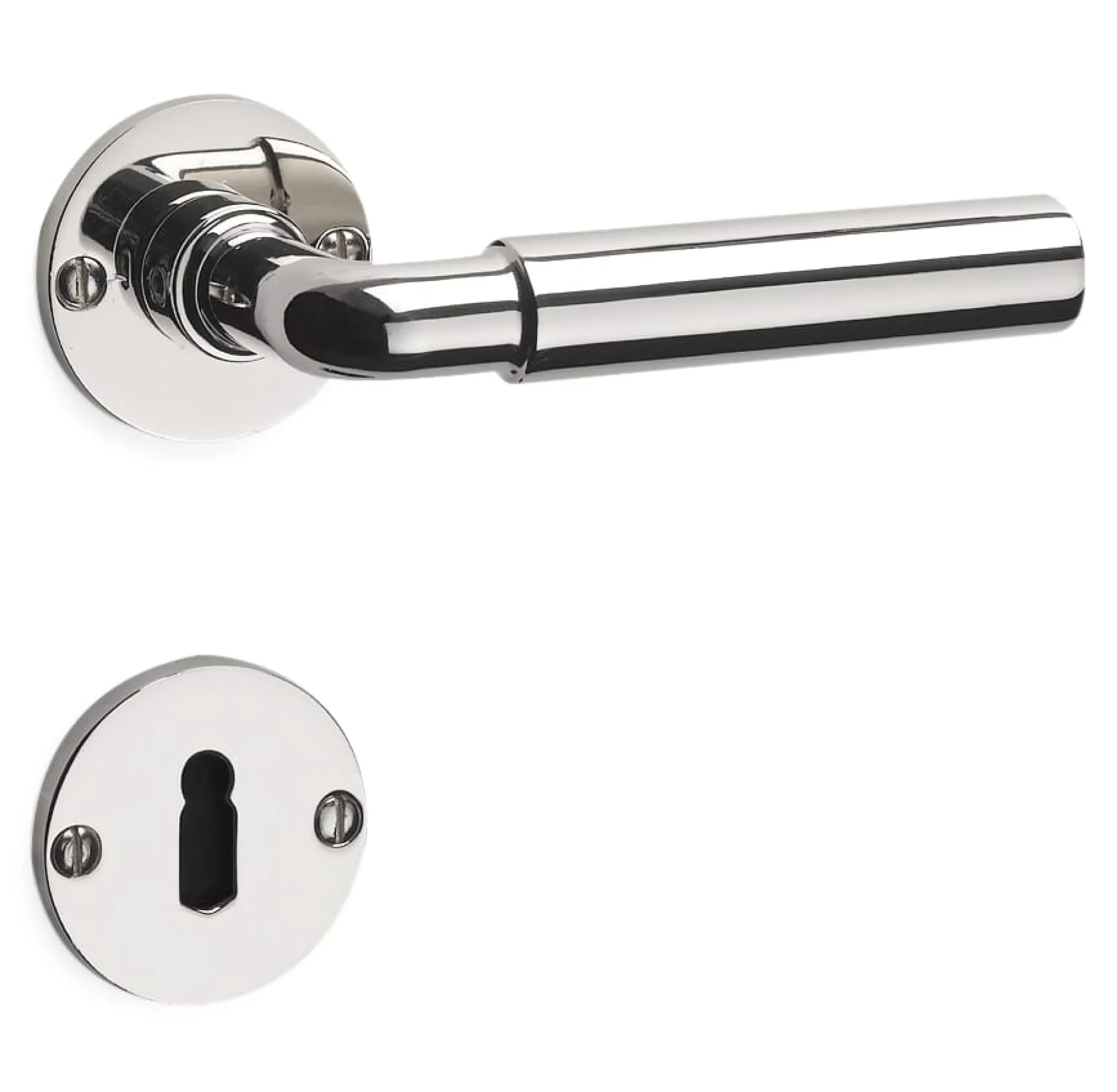 Zwei schlichte und schnörkellose Türgriffe aus Zinkdruckguß, vernickelt und poliert. Grifflänge 11,5 cm, 2 cm Ø. Gewicht eines Griffs ca. 250 g. Zur Verwendung mit den passenden Langschildern oder Rosetten (welche nicht in der Lieferung enthalten sind). Lieferung ohne Schrauben.