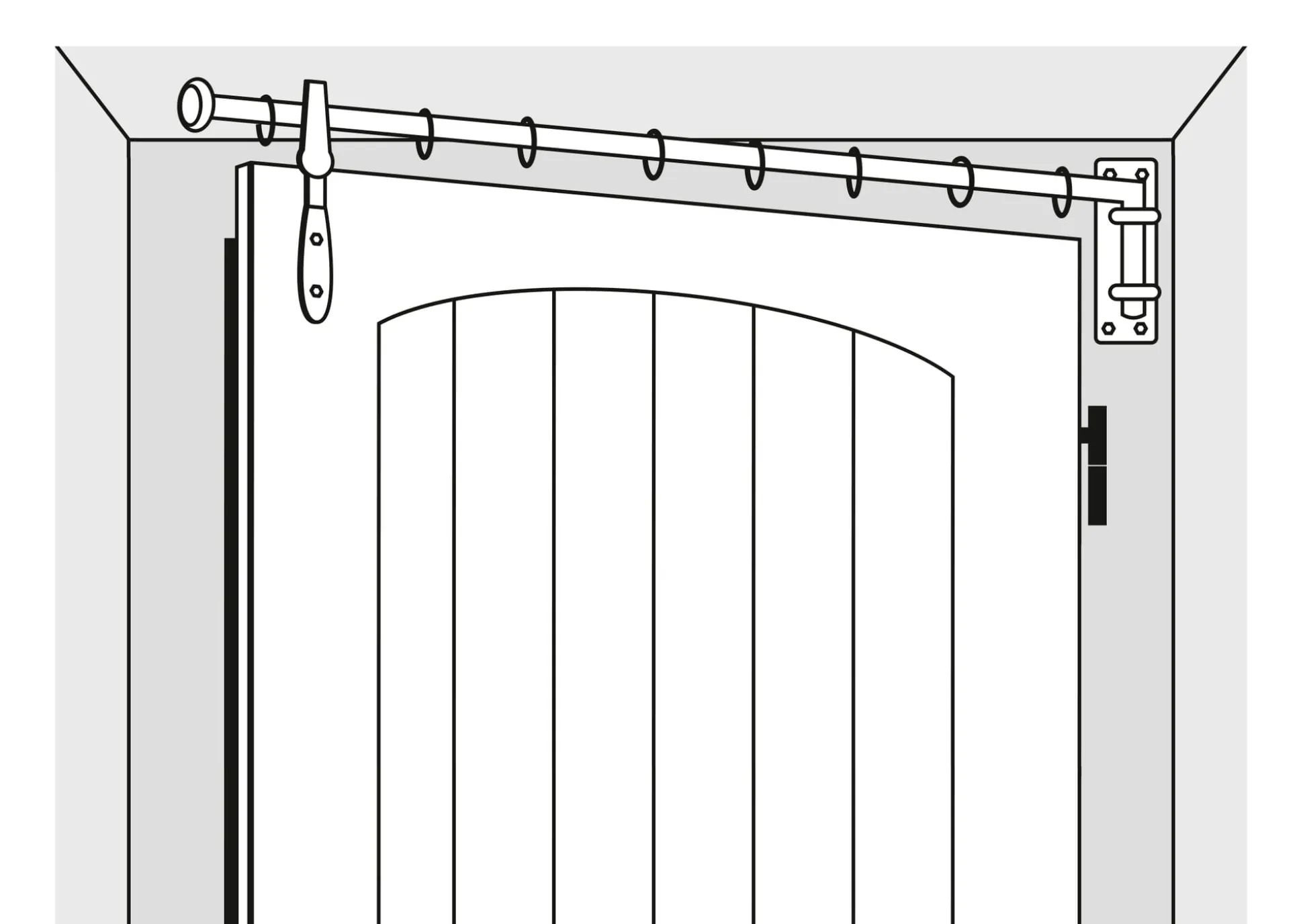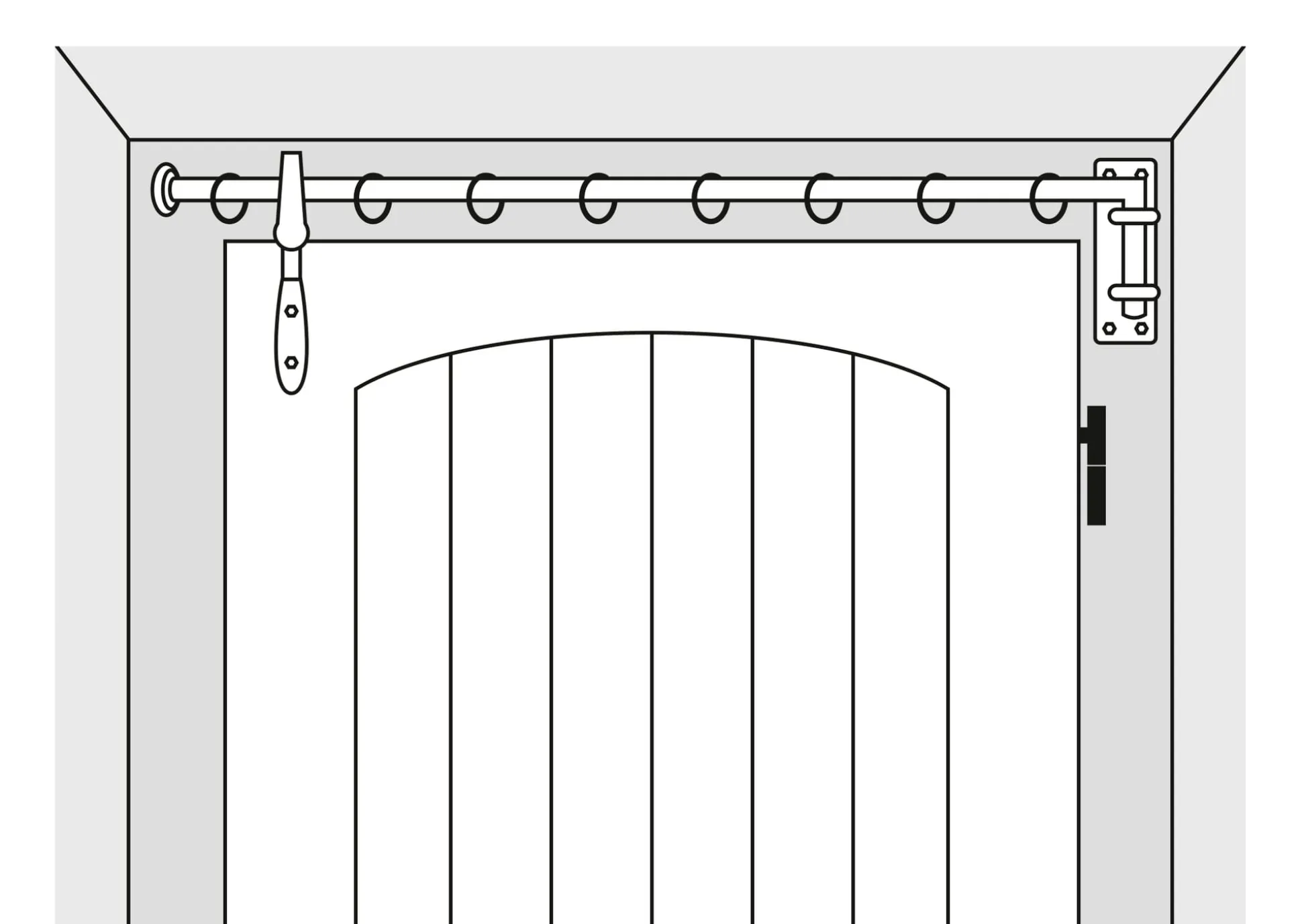 Dieser Türträger wird als Ergänzung zu unserer schmiedeeisernen Vorhangstange Schwenkarm an der Tür angebracht. Der lange Schenkel des Schwenkarms läuft dann in der Öse bei jeder Bewegung der Tür mit, sodass sich beim Öffnen und Schließen der Schwenkarm samt Vorhang mitbewegt.