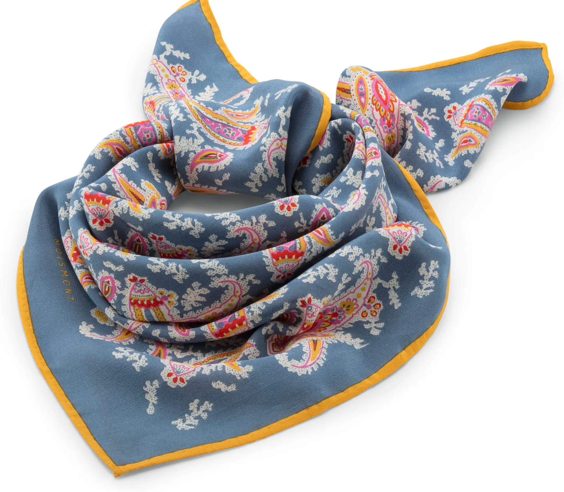 Das Paisleymuster hat seinen Namen von der gleichnamigen Stadt in Schottland, in der im 19. Jahrhundert große Mengen Textilien mit diesem Muster produziert wurden. Seinen Ursprung hat es jedoch in Persien, von wo es nach Indien kam. Dort entdeckten es wiederum die Briten und brachten es nach Europa. Moismont hat das Paisleymuster mit diesem Tuch gewissermaßen nach Indien zurückgeführt. Das handwerklich bedruckte feine Tuch besteht aus leichter, fließend fallender Seide. Seine Kanten sind gesäumt, der Moismont-Schriftzug ist farblich passend aufgedruckt.
