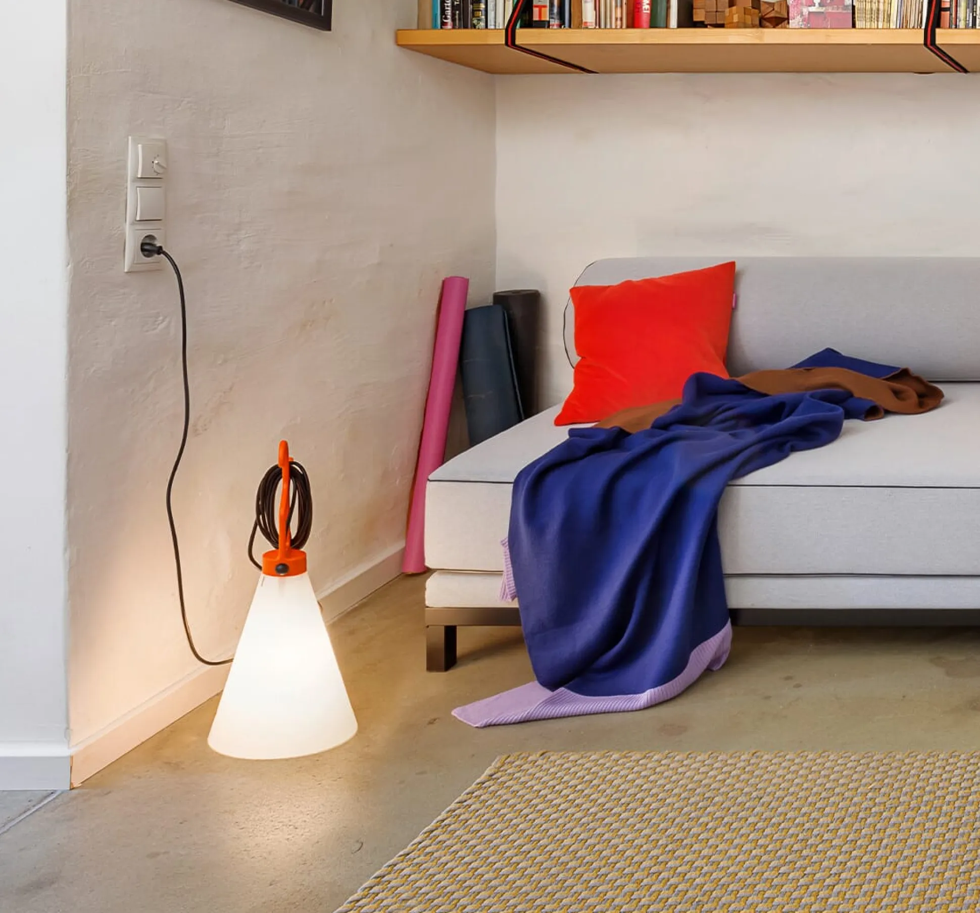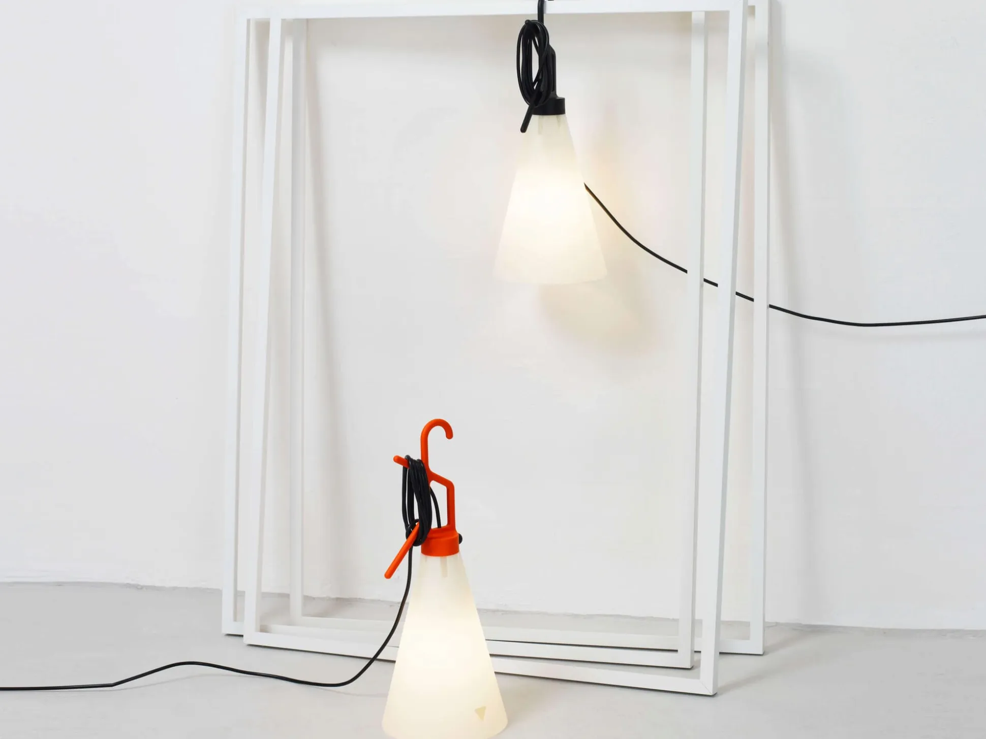 Variabel einsetzbare Pendel-, Wand- oder Bodenleuchte für die Nutzung überall dort, wo eine robuste und flexible Leuchte schnell zur Hand sein soll. Das fast 5 m lange Kabel sorgt für viel Bewegungsfreiheit, der ikonische, opalweiße Diffusor für ein angenehm mildes und zugleich helles Licht. Formales Herzstück des Entwurfs ist der Transportgriff der Leuchte, der gleichzeitig auch als Haken zum Aufhängen und als Kabelaufwicklung dient.