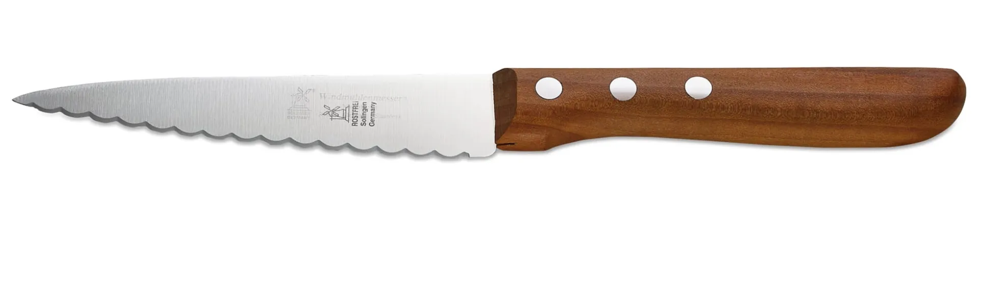 Klinge Chrom-Molybdän-Vanadium-Stahl (rostfrei), mit beidseitigem konvexem Wellenschliff. Heftschalen aus gedämpftem Apfelbaumholz. Klingenlänge 12,5 cm, Gesamtlänge 25 cm. Gewicht 50 g. Dieses Messer ist auch für Linkshänder geeignet.