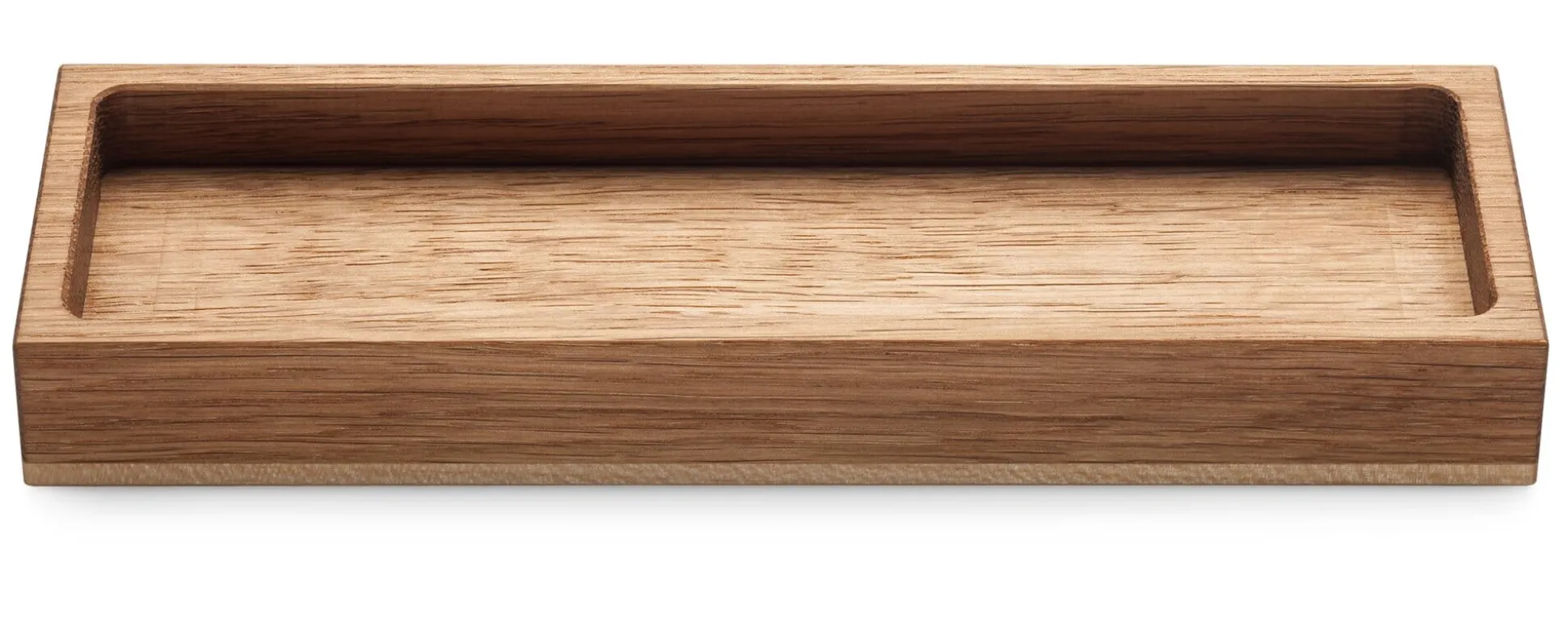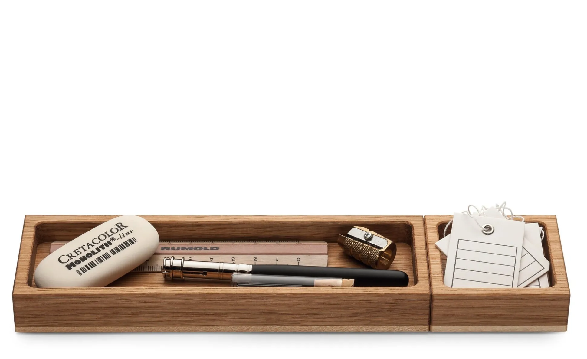 Diese Schreibtischutensilien nehmen auch als gestaltete Objekte Rücksicht darauf: Es sind einfache Ablagen aus geöltem Eichen- und Ahornholz. Sie stammen aus dem bayerischen Steinhöring und sind in ihren Dimensionen so aufeinander abgestimmt, dass sich die Einzelelemente kombinieren lassen. Die kleinere der beiden Stiftschalen mit Griffmulde – ursprünglich für die Präsentation von Schreibgeräten im Schreibwarenhandel entwickelt – wird in Steinhöring infolge nicht nachlassender Kundenanfragen nach unseren Maßgaben gefertigt. Sie bringt die Idee des „weniger ist mehr“ gänzlich auf den Punkt und nimmt ein einziges, mithin das am liebsten und häufigsten benutzte Schreibgerät auf. Alle Ablagen sind für den Schutz der Schreibtischoberfläche mit jeweils vier Kunststofffüßchen versehen.