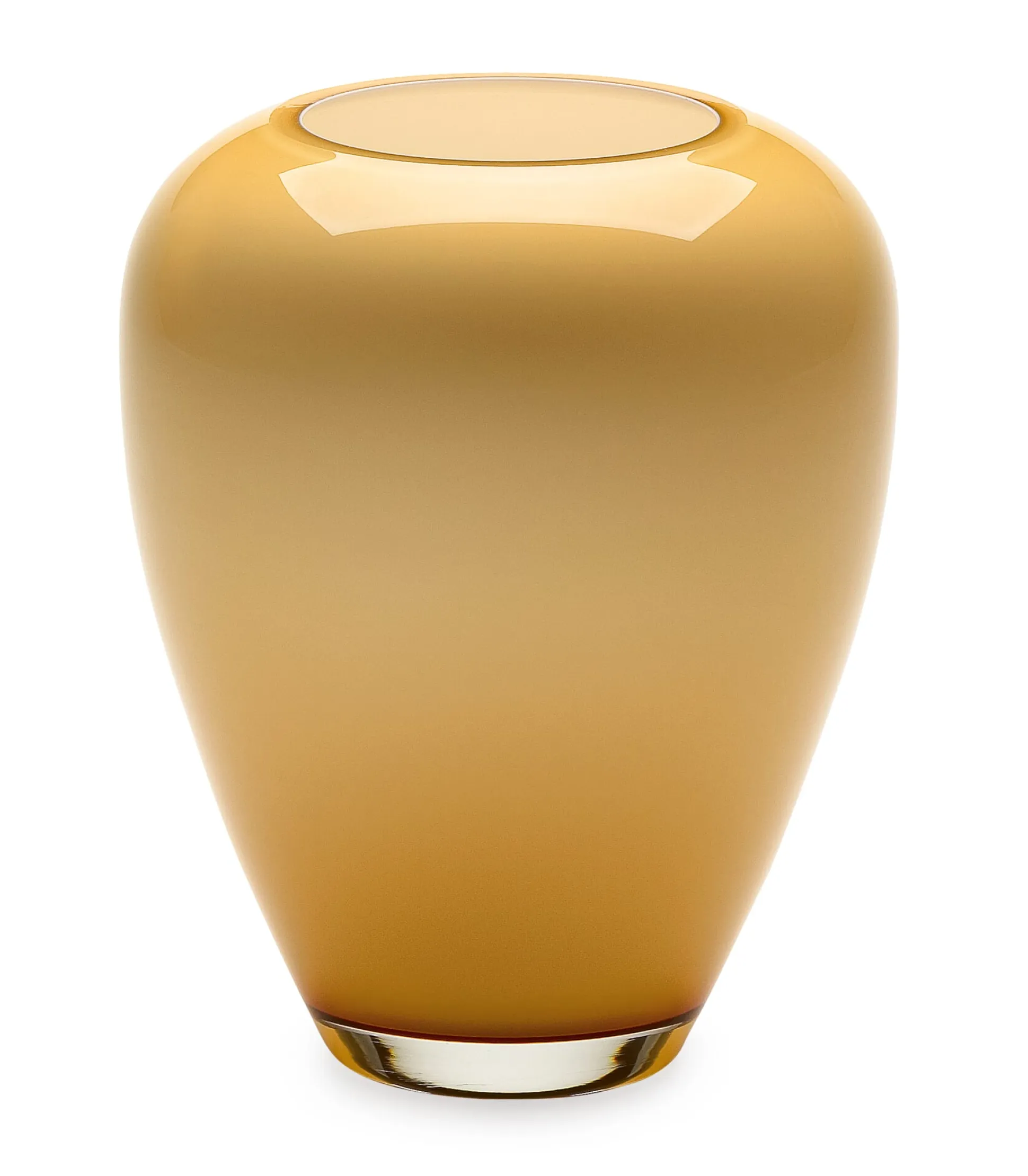 Für größere Sträuße, langstielige Schnittblumen oder einzelne Zweige. In Überfangtechnik mundgeblasen. Innen opalweiß, außen honiggelb. Höhe 26,5 cm, 21,5 cm Ø. Gewicht 2,9 kg.