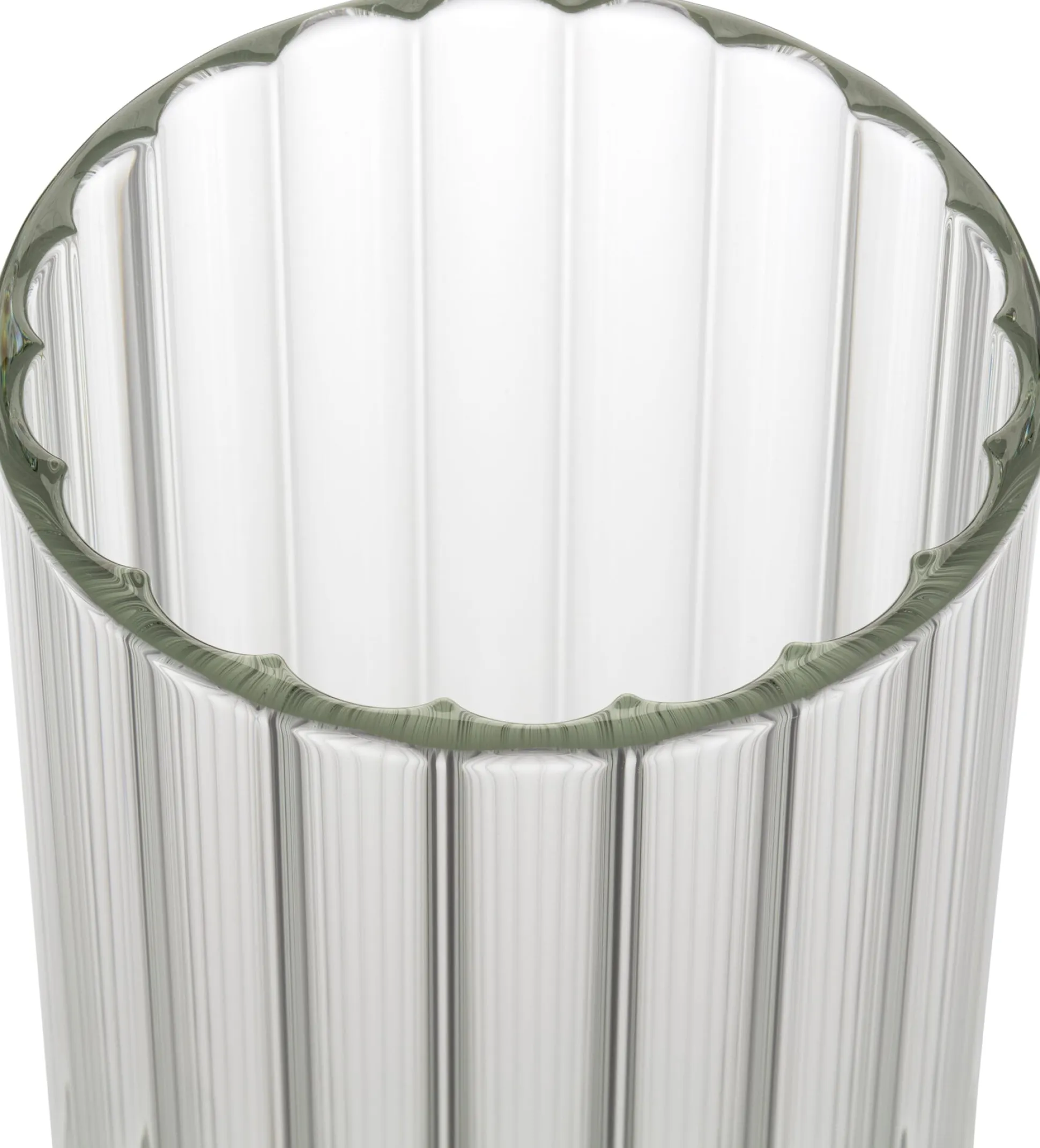 Schön technisch und mit interessantem optischem Effekt: Vasen aus gewelltem, industriell vorgefertigtem Borosilikatglas. Die gläsernen Strangprofile werden in einem handwerklichen Prozess eingekürzt und durch Verschmelzen des Materials verschlossen. Durch die im Innern des Behälters verlaufende Rillung, lassen sich Blumen und Sträuße gut und stabil in Form bringen. Spülmaschinengeeignet.