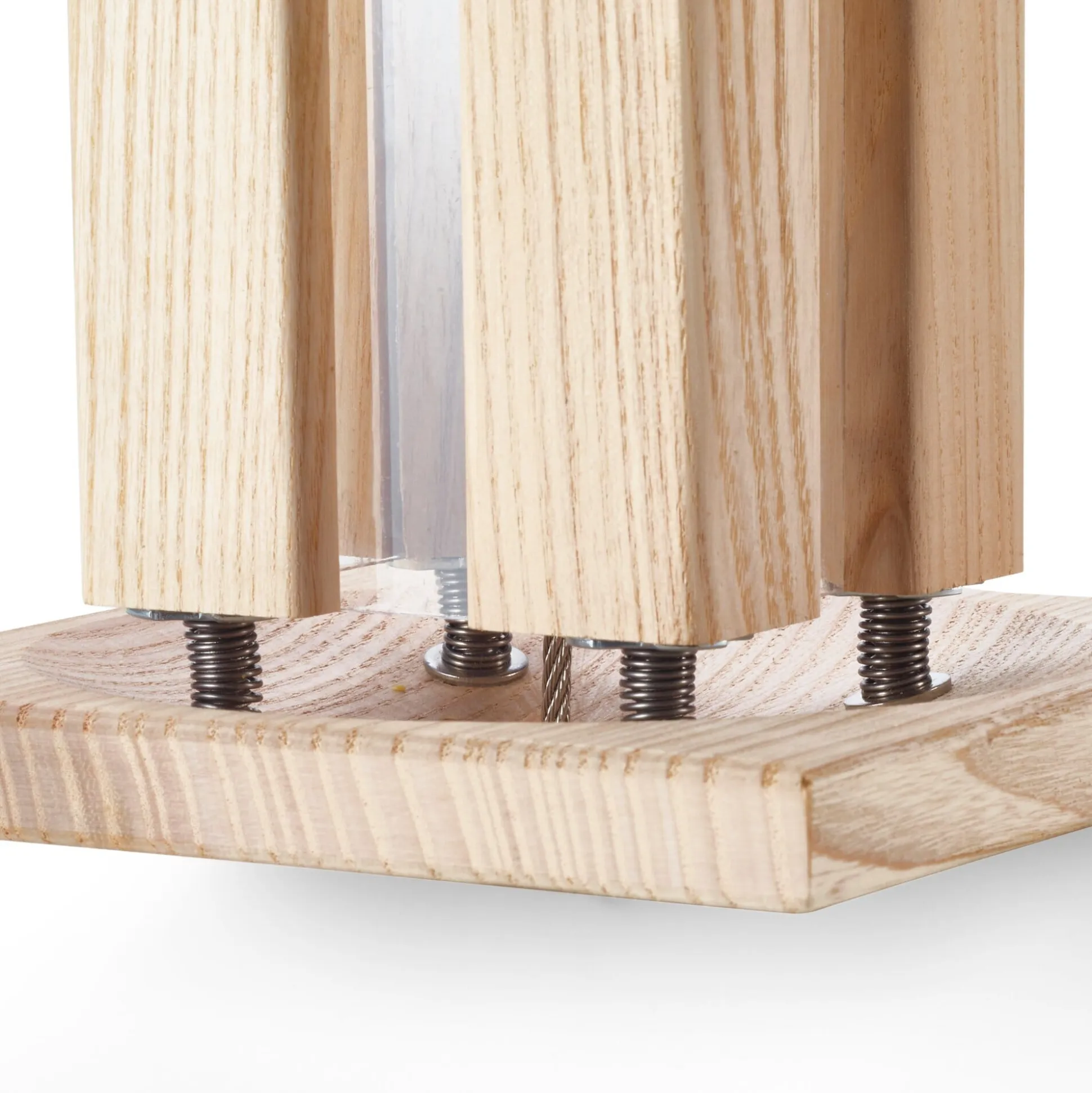 Bodenplatte mit Wasserabzugslöchern. Korpus aus Eschenholz, Futtersilo aus Plexiglas. Stabiles Aufhängeseil aus Edelstahldraht, mit Schlaufe.