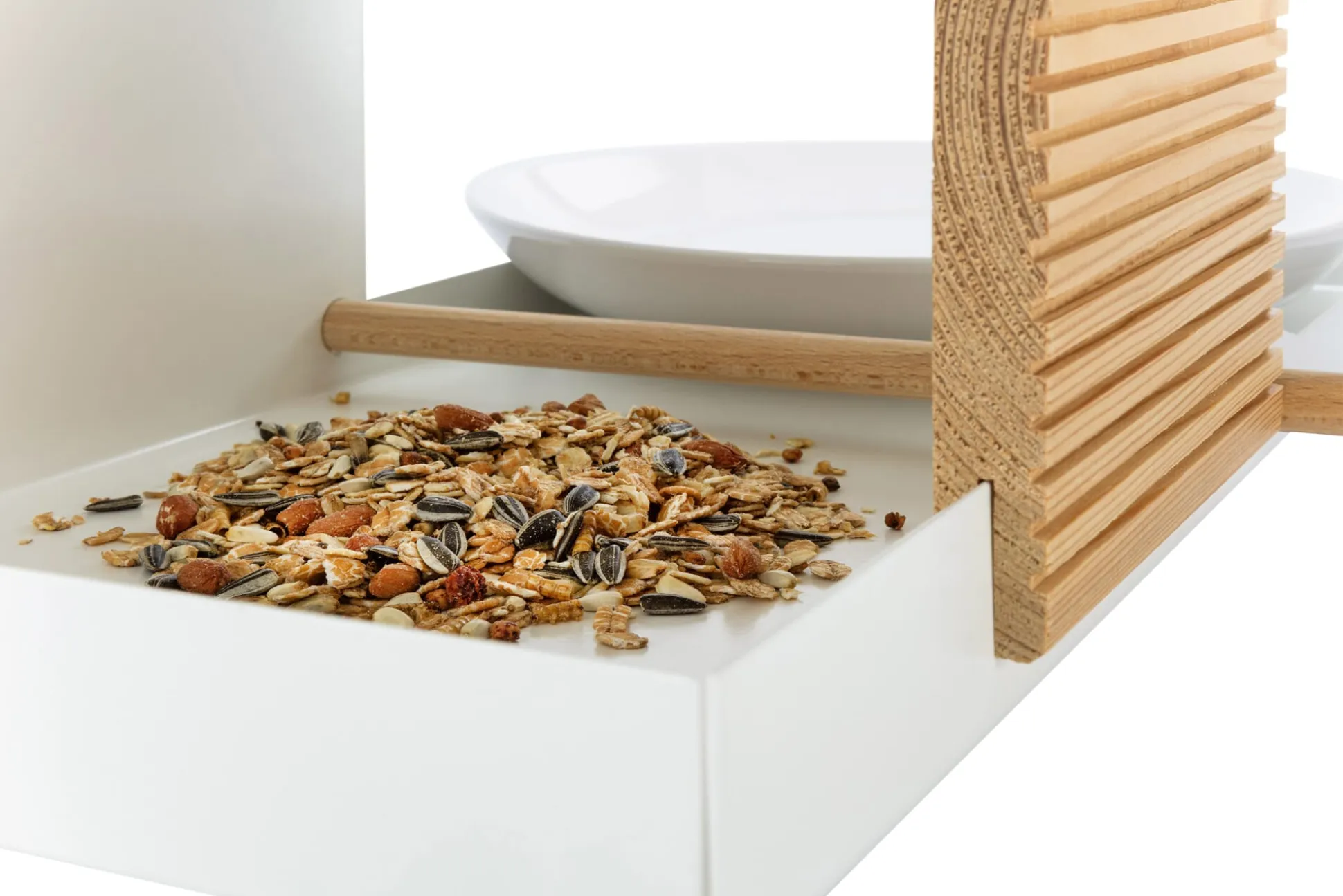 Oder: Tiny House mit Pool! Schlicht schön und klar in der Formensprache – diese frei stehende Vogelfutterstation passt sich in den kürzlich eingerichteten Hausgarten im Neubaugebiet ebenso ein wie in den gewachsenen, naturnah gestalteten Garten am Stadtrand oder in den Schrebergarten. Ihr geradliniges Design kommt ohne jede dekorative Übertreibung aus. Ein Service für die bei Ihnen lebenden Wildvögel: Nach dem Essen können sie gleich einen Schluck trinken oder sich in der großzügigen Wasserschale aus frostfestem Hartporzellan das Gefieder reinigen (vielleicht auch beides), und das alles ungestört und mit Weitsicht. Denn das Häuschen mit Terrasse ruht auf einem in zwei Teilen gelieferten, stabilen Edelstahlstab von eineinhalb Meter Länge. In katzensicherer Höhe, heißt das bei uns, da selbst ein außergewöhnlich sprunggewaltiger Stubentiger von den Vögeln aus dieser Höhe frühzeitig gesichtet werden kann. Zusätzlich zu Streufutter, das unter dem weit vorspringen Dach vor Nässe geschützt bleibt, können Sie Vogelknödel anbieten; dafür ist an der Unterseite des Gehäuses aus wetterfest pulverbeschichtetem Edelstahl eigens eine Halterung angebracht. Apropos wetterfest: Das Holzmodul mit seinen präzise gefrästen Nuten besteht aus Lärchenholz, das dank seines natürlichen Harzgehaltes auch unbehandelt über ausreichende Feuchtebeständigkeit verfügt. Behalten Sie nur im Sinn, dass das Holz im Laufe der Jahre vergrauen wird.