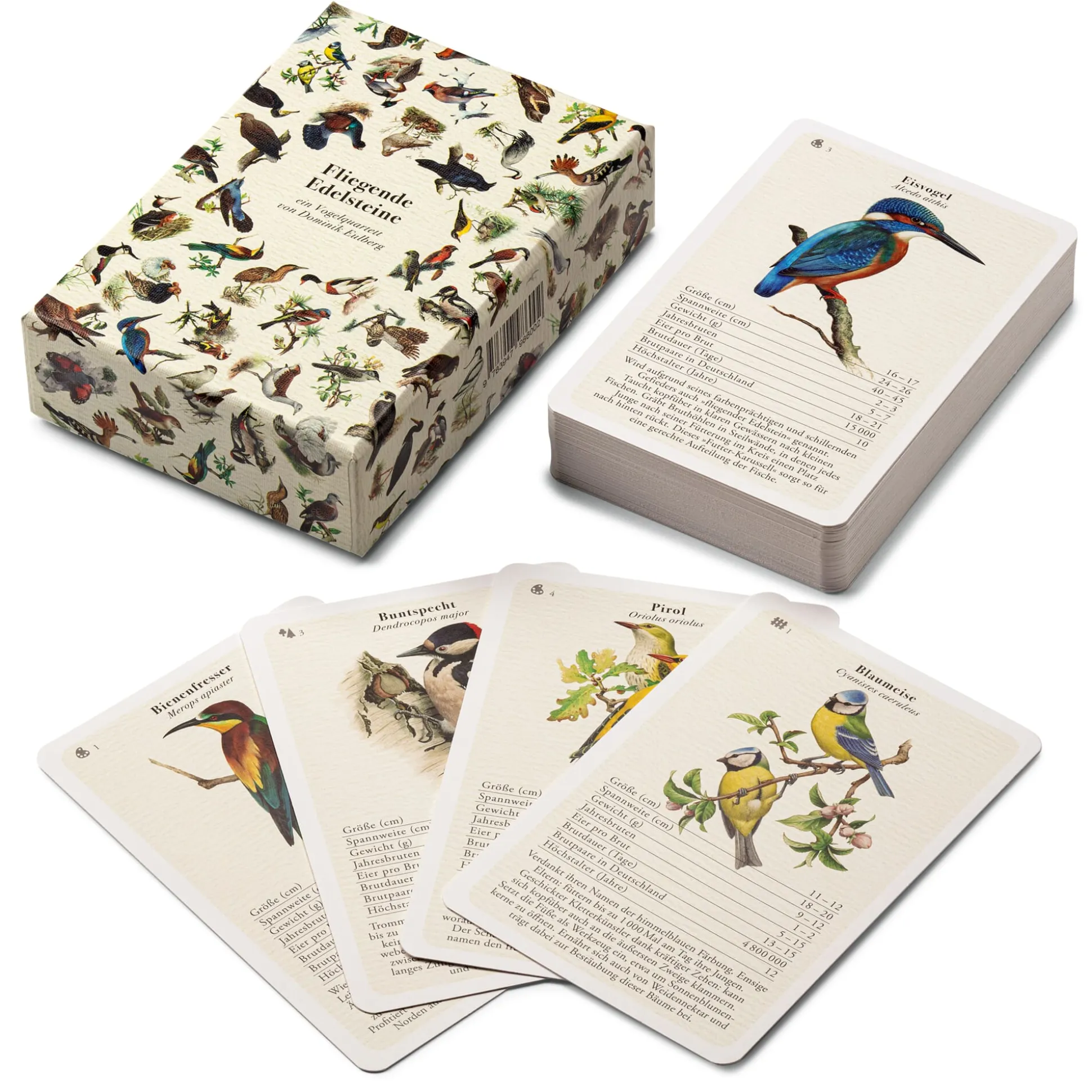 Das alles und noch viel mehr lernt man bei dem von Dominik Eulberg entworfenen Vogelquartett. Es beinhaltet 56 Spielkarten heimischer Vogelarten, die einen Querschnitt durch alle Vogelfamilien darstellen – von seltenen Vögeln wie dem Bienenfresser oder dem Ziegenmelker bis hin zu häufigen Zaungästen wie dem Rotkehlchen oder der Blaumeise. Besonderen Charme erhält das Quartett durch die naturnahen und kunstfertigen Illustrationen von Tiermalern wie Franz Murr, Robert Scholz und R. A. Vowles.
