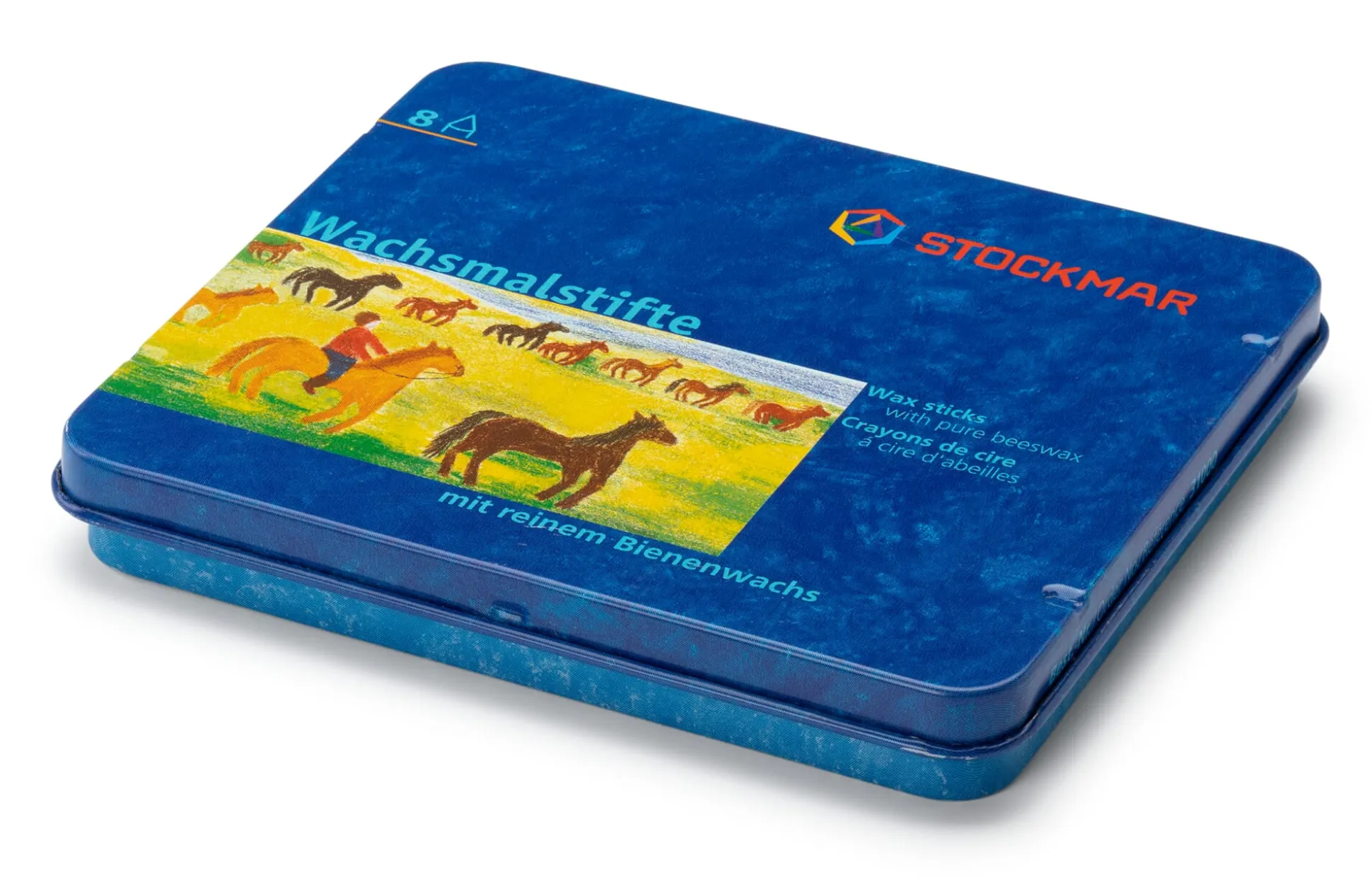 8 Wachsmalstifte, jeweils Länge 8 cm, Ø 1 cm. In einer Blechdose, Breite 10,5 cm, Länge 9,5 cm, Höhe 1,5 cm. Mit Schaber. Gesamtgewicht 135 g.