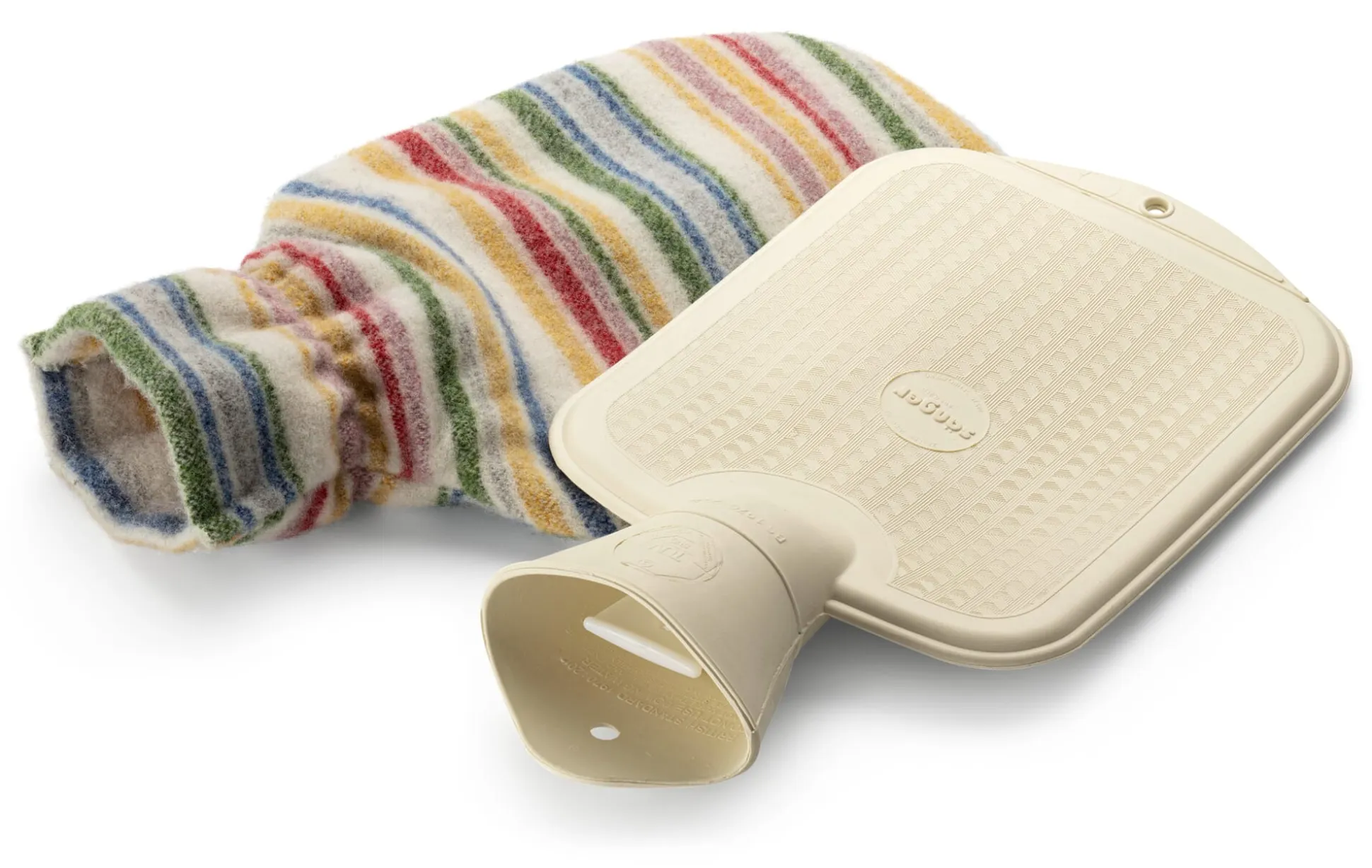 Bis dahin umhüllt der Bezug eine Wärmflasche, die inklusive Halsstück in einem Stück aus Naturkautschuk geformt ist – eine zusätzliche Naht, die brüchig werden könnte, ist dadurch obsolet. Und das vermessingte Gewinde schließt auslaufsicher mit einer stabilen Verschlussschraube (aus Kunststoff).