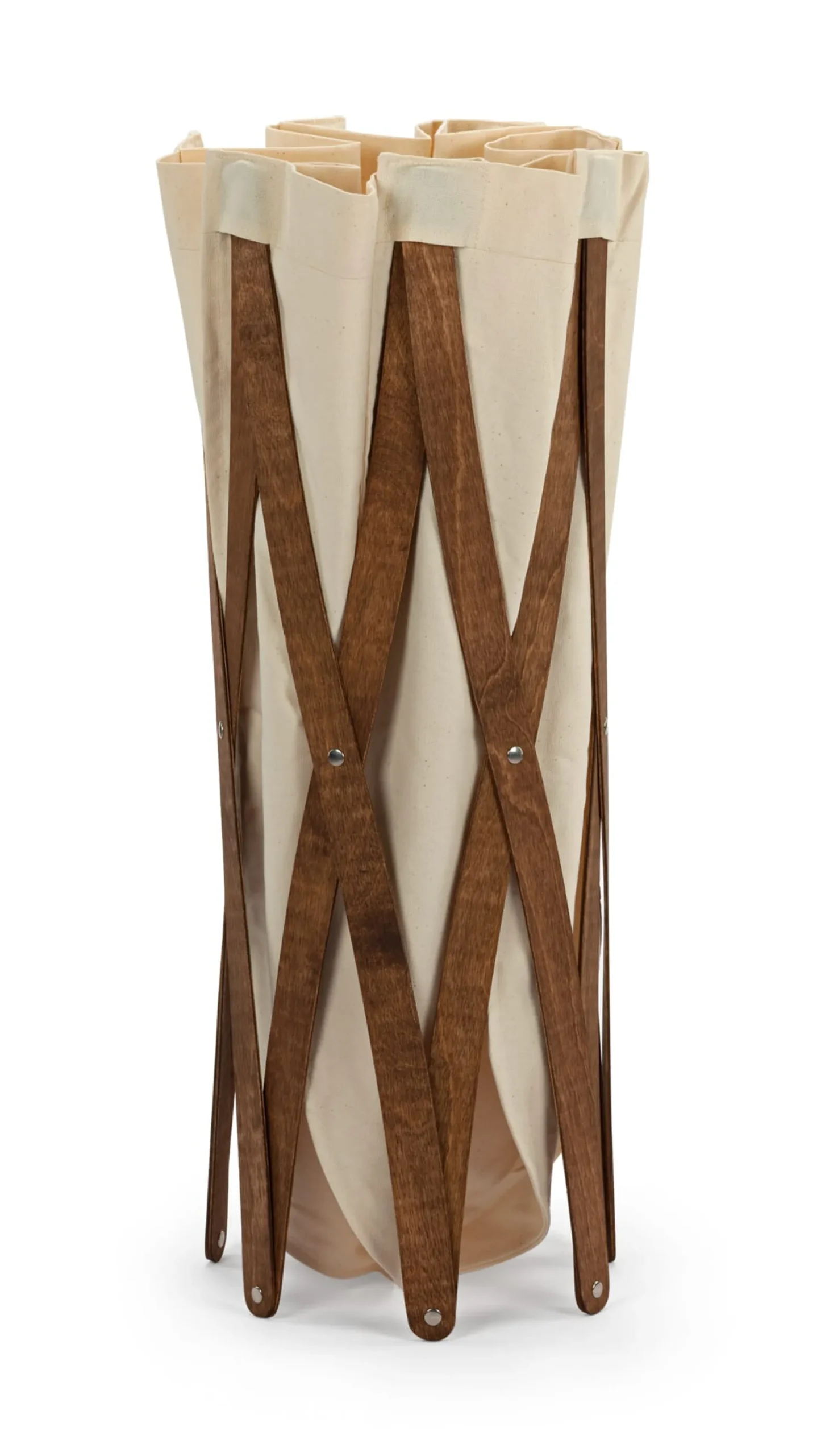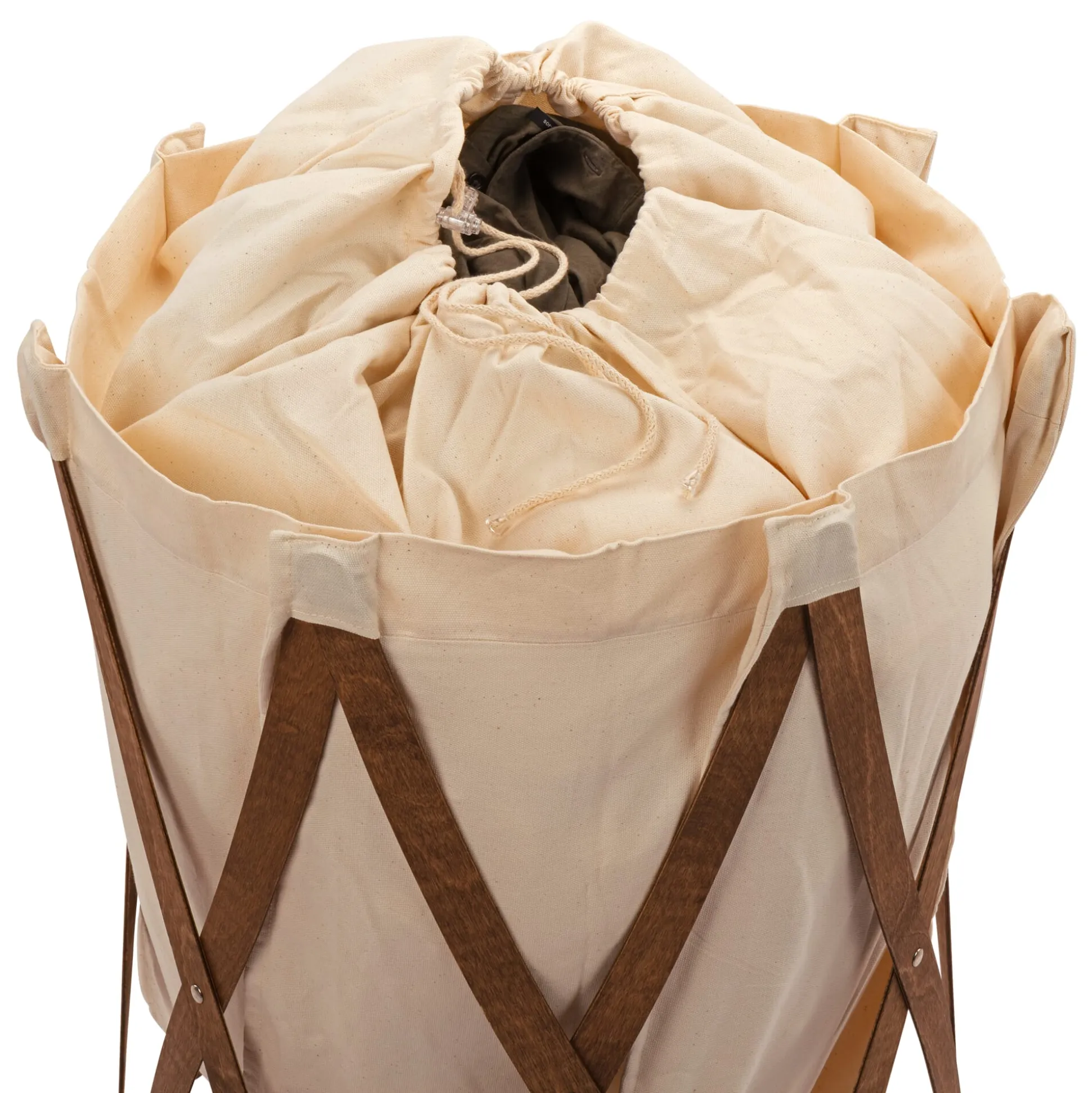 Gestell aus Sperrholz, Ø 15 bis max. 50 cm, Höhe 70 cm. Wäschebeutel aus 100% Baumwolle in Polen konfektioniert, Volumen ca. 130 l. Gewicht 1,5 kg. Hergestellt in Deutschland.
