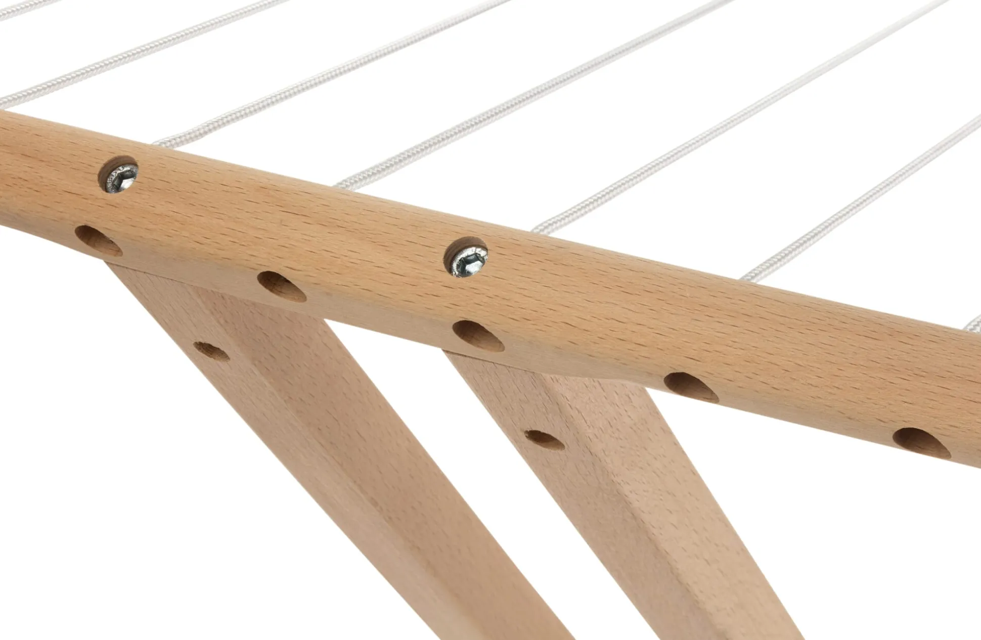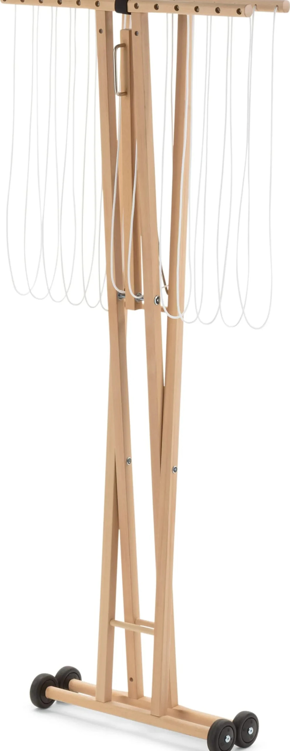 Buchenholz (Herkunft Deutschland) unbehandelt. Schnur aus 16-fach geflochtenem Polypropylen. Kugelgelagerte Räder (Ø 75 mm) aus Kunststoff und thermoplastischem Gummi. Ausgeklappt Höhe 106,5 cm, Breite 135 cm, Tiefe 64 cm. Eingeklappt Höhe 152 cm, Breite 64 cm, Tiefe 15 cm. Gewicht 4,5 kg. Maximales Belastungsgewicht 20 kg. Die Lieferung erfolgt teilmontiert. Inklusive Anleitung und Klettband zur Fixierung beim Zusammenklappen.