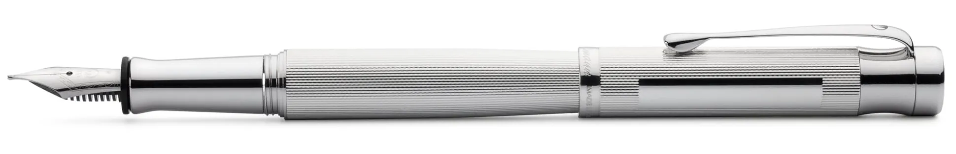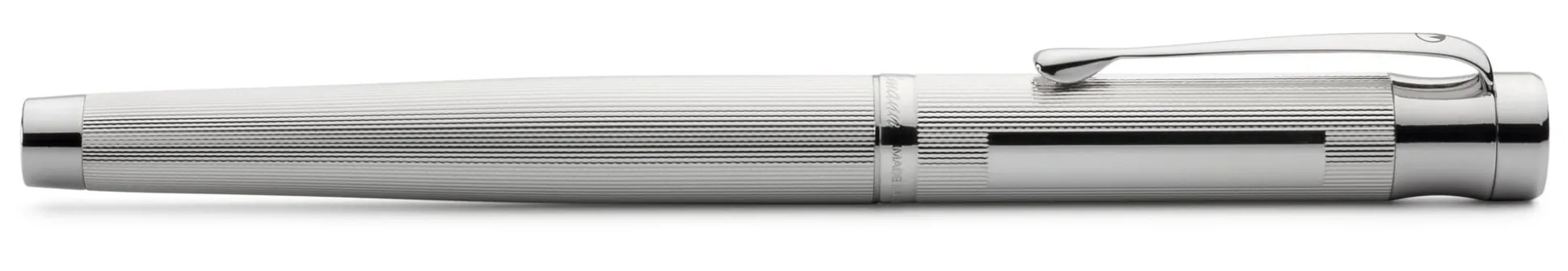 Korpus 925er Silber massiv mit feiner Korn- bzw. Linienguilloche und glänzend poliertem Gravurfeld (30 x 5 mm). Schraubbare Kappe zum Verschließen und Verlängern, Kappengewinde Kunststoff. Clip Stahl vernickelt, rhodiniert. Feder Edelstahl, poliert, mit Iridiumkorn. Länge geschlossen 13,5 cm, schreibfertig 12 cm. Gewicht 40 g. Federbreiten F, M und B (bitte bei der Bestellung angeben). Lieferung mit 6 Standardpatronen in Blau, Konverter und Silberputztuch.