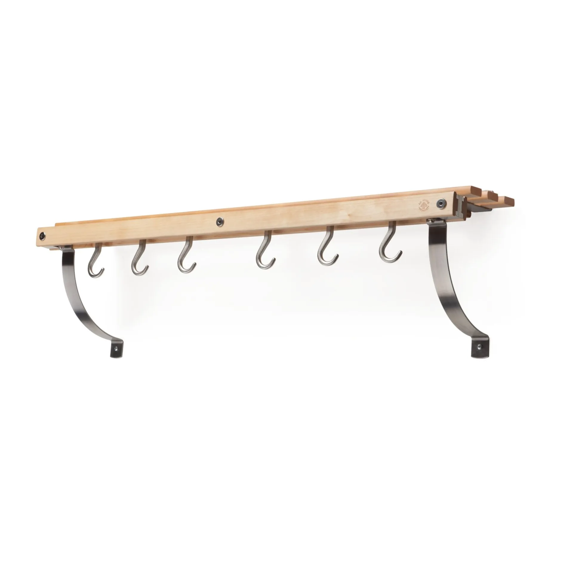 Ablage Ahornholz geölt. Konsolen Edelstahl, je bestehend aus Arm und Bogen. 6 passende Topfhaken aus vernickeltem Zinkdruckguss liegen jedem Wandregal bei.