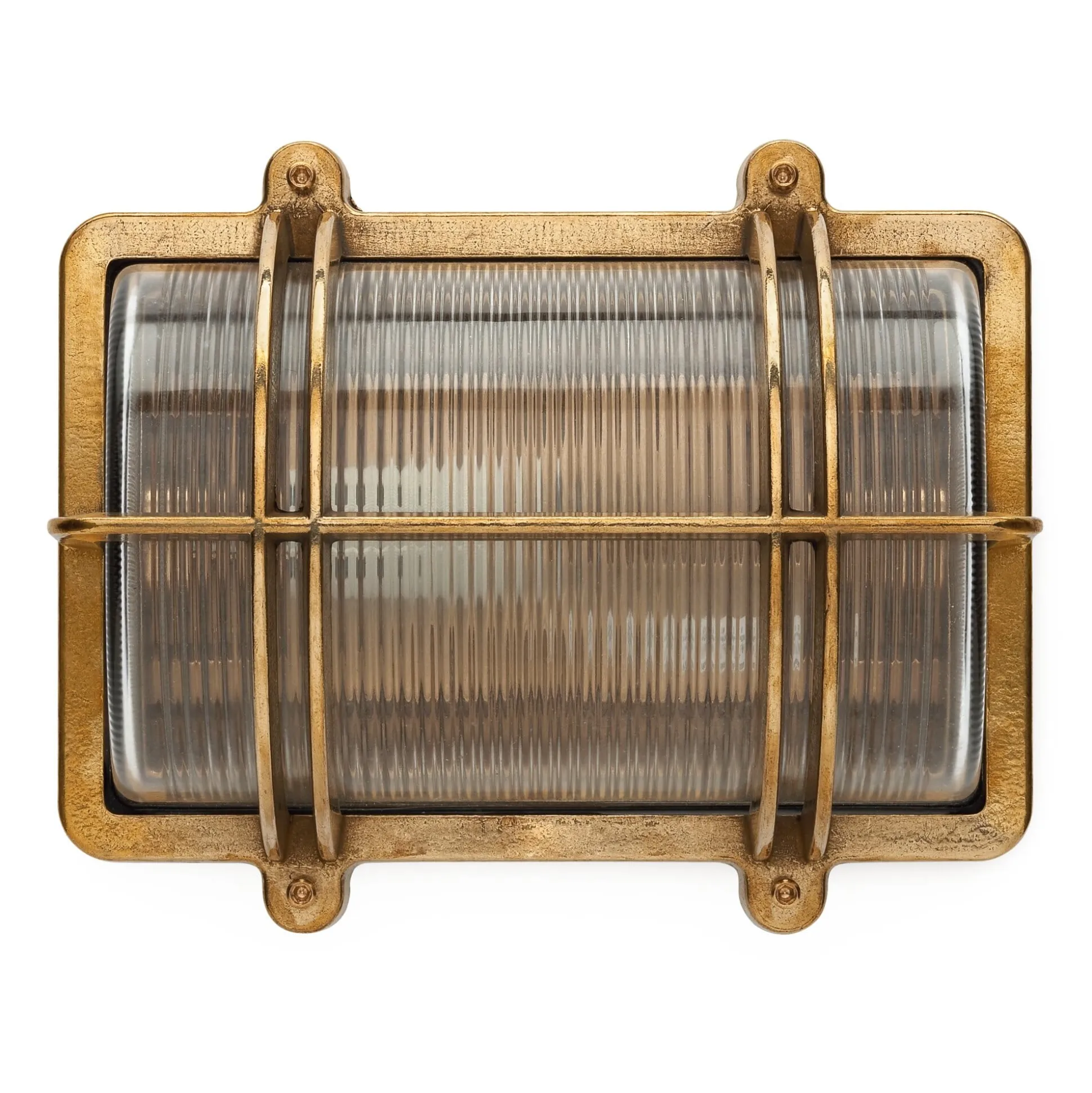 Mit Korpus aus Messingguss, Kuppel aus geriffeltem Pressglas. Keramikfassung E27 (max. 60 W). IP 54. Ohne Leuchtmittel und Befestigungsmaterial. Länge 26 cm, Breite 21,5 cm, Tiefe 13,5 cm. Gewicht 3,7 kg.