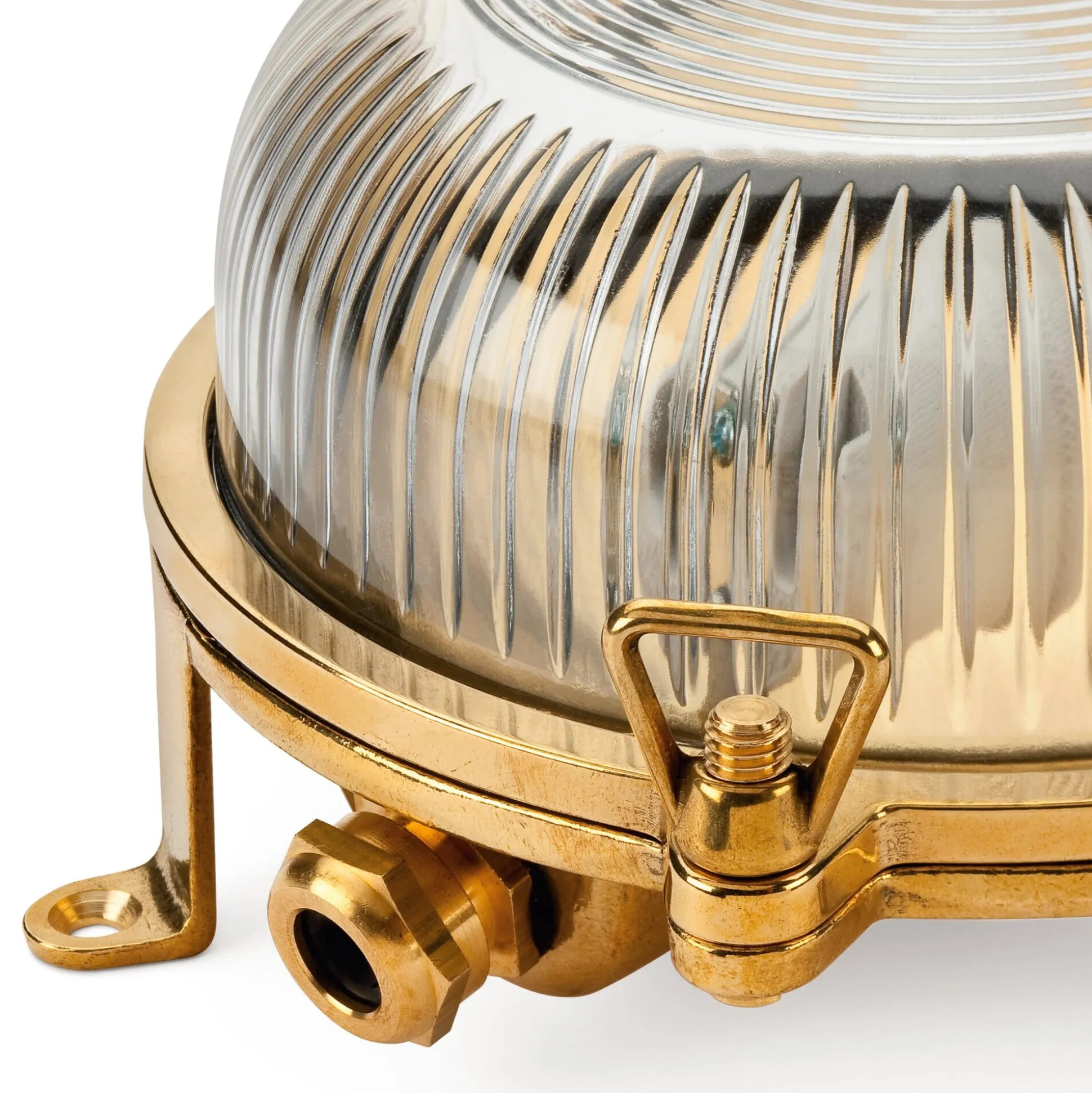 Korpus aus Messingguss, Kuppel aus geriffeltem Pressglas. Keramikfassung E 27 (max. 60 W). IP 54. Hergestellt in Italien. Ø 21 cm, Tiefe 10,5 cm. Gewicht 1,6 kg. Lieferung ohne Leuchtmittel und ohne Befestigungsmaterial.