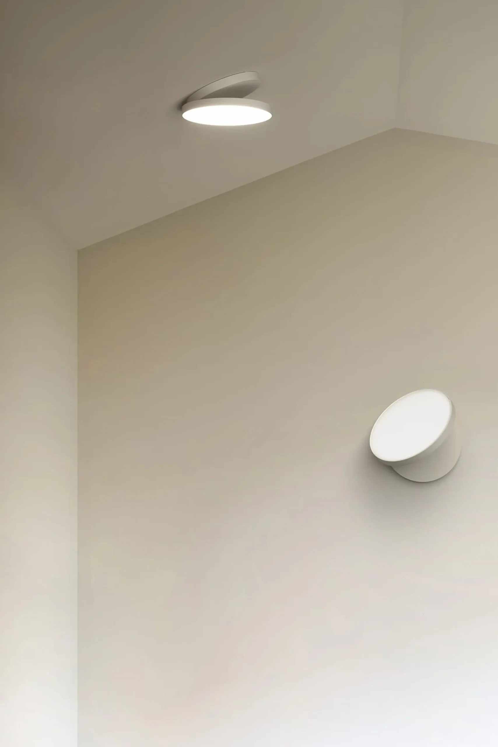 Zwei unterschiedlich große kreisrunde Elemente aus Aluminiumguss sind per Scharnier miteinander verbunden und passen exakt übereinander – wie der Deckel auf eine Schachtel. Die größere Komponente integriert den Leuchtkörper mit Diffusor aus spritzgegossenem, opalen Polycarbonat, während das kleinere Element der Befestigung an Wand oder Decke dient.
