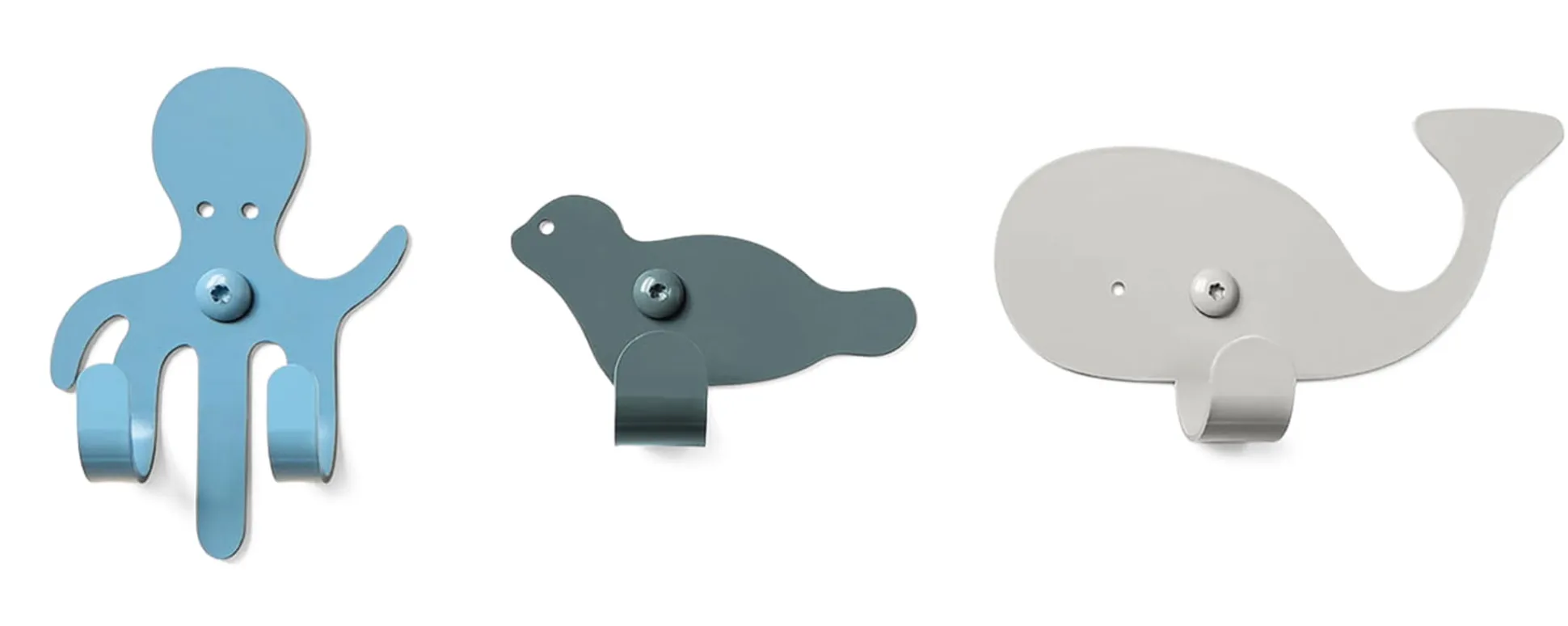 Farben: Octopus: Pastellblau RAL 5024, Robbe: Blaugrau RAL 7031, Wal: Fenstergrau RAL 7031