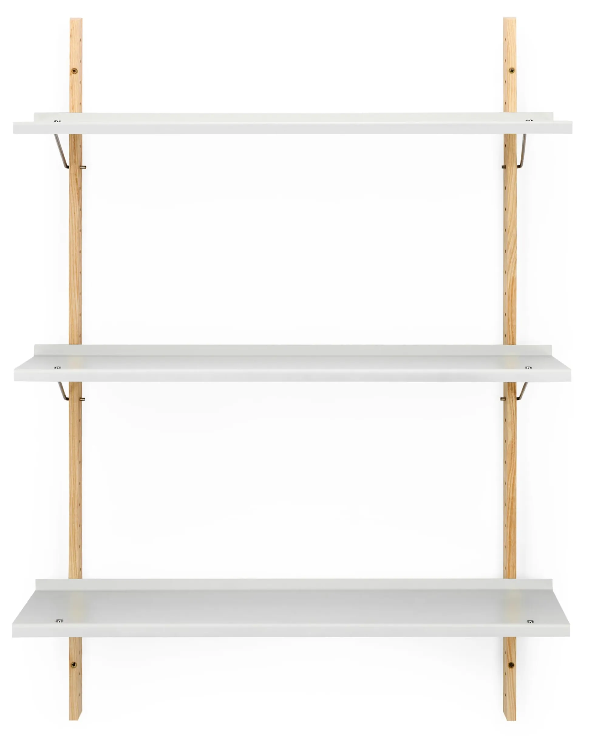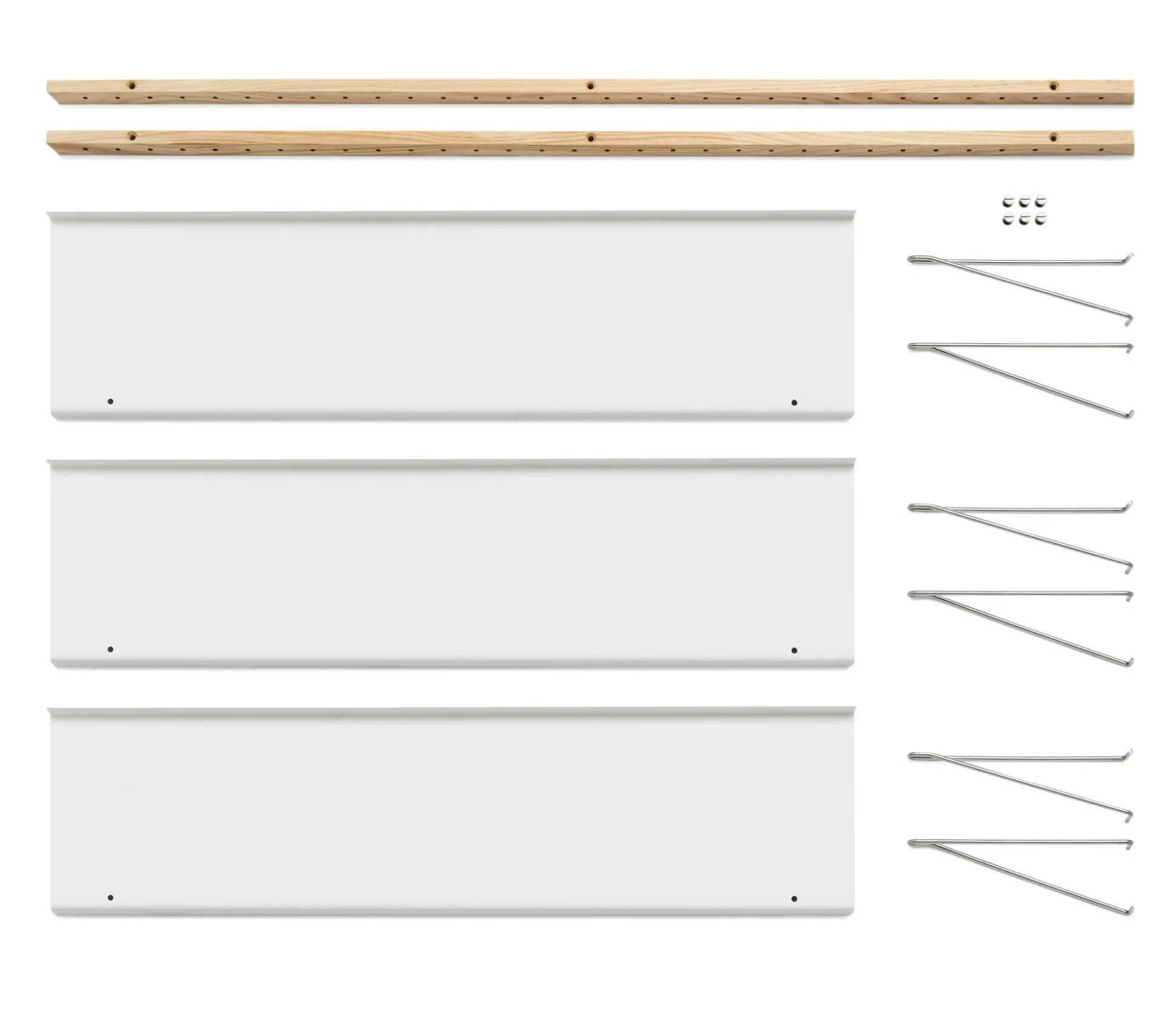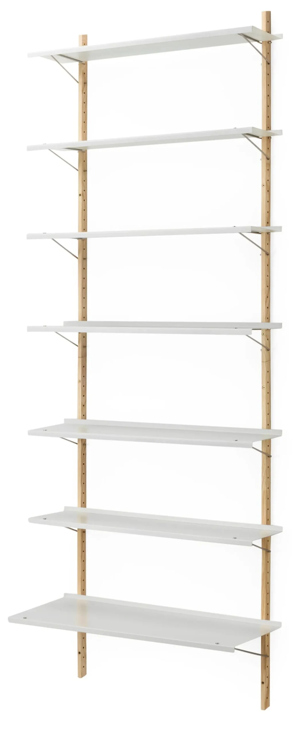 Material: Wandprofil: Esche, massiv (Herkunft: Kanada); Regalböden: Stahlblech, pulverbeschichtet; Bodenträger: Edelstahldraht