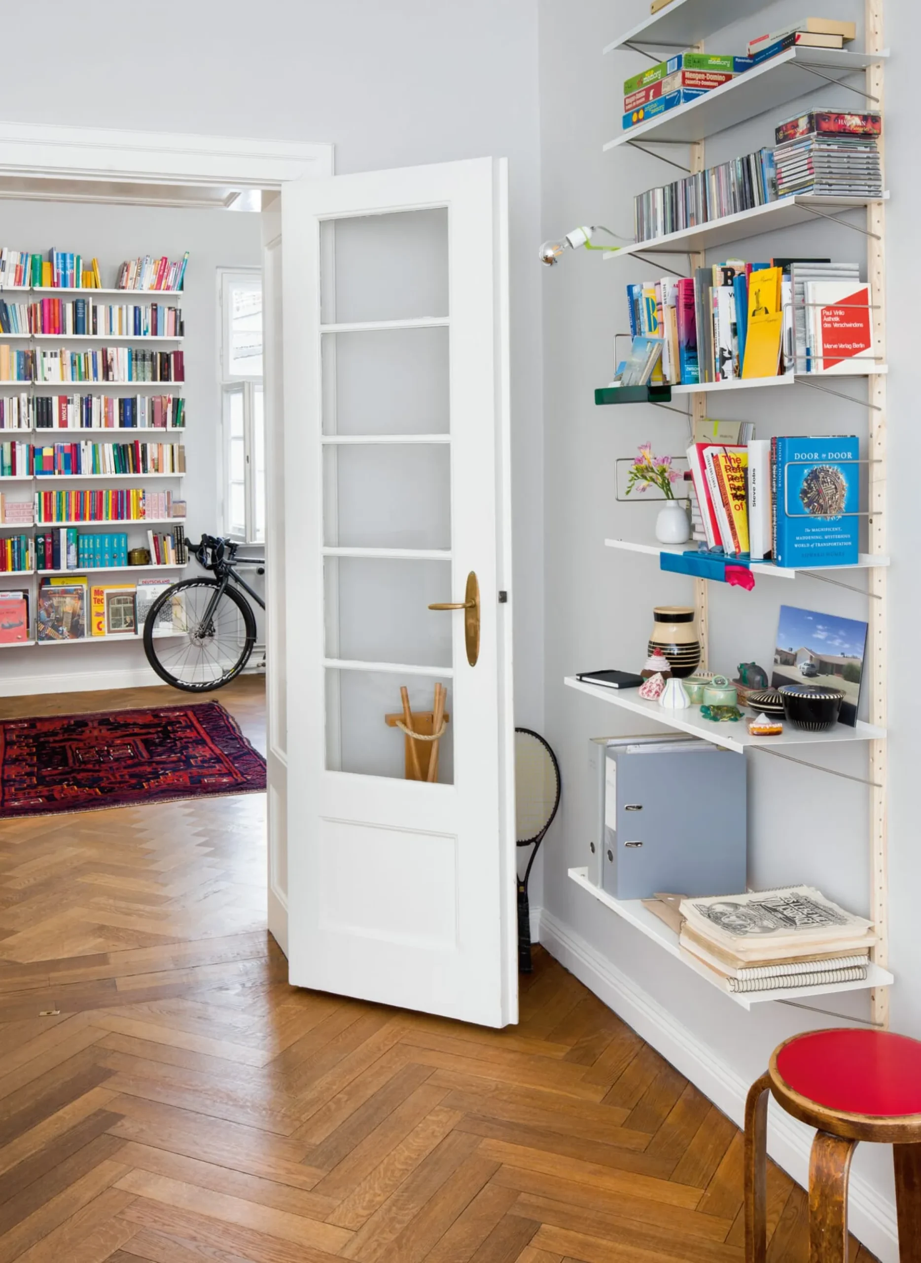 Filigranes Wandregal für Bücher, das private Büro oder auch in Küche und Bad. RM3 zeigt perfekte Materialökonomie – Boden aus Stahlblech, Bügel aus Edelstahl und ein massives Holzprofil – diese drei Materialien begegnen sich bei diesem Produkt auf ideale Weise. Der Entwurf basiert auf der klugen Nutzung der jeweiligen Eigenschaften der Materialien. Die Enden des mehrfach gebogenen Fachbodenträgers aus Edelstahldraht greifen dabei in das hölzerne Wandprofil und verbinden mit minimiertem Materialeinsatz das senkrechte Profil und den waagerechten Fachboden. Das Grundregal RM3 besteht aus zwei Wandprofilen aus massivem Eschenholz, drei Fachböden in der Tiefe von 20 Zentimetern sowie den benötigten Montagezubehören. Mithilfe von weiteren separat lieferbaren Fachböden – auch in der Tiefe von 30 Zentimetern – sowie Buchstützen aus Edelstahldraht lässt sich das Regal erweitern. Die Kombination von zwei RM3 übereinander ergibt das quasi raumhohe Regal, wobei sich die an ihren Enden im Winkel gefügten Holzprofile perfekt ineinander schmiegen. Die maximale Traglast eines Fachbodens beträgt 15 Kilogramm.