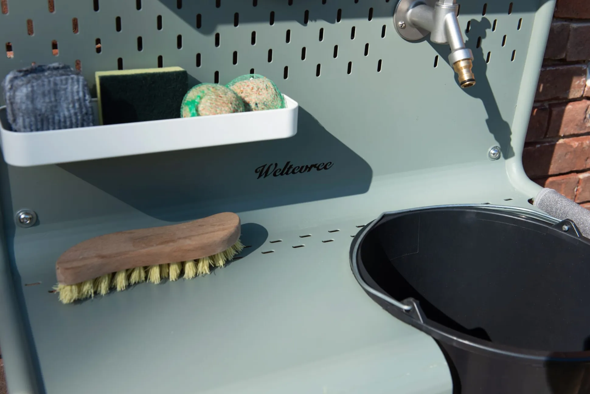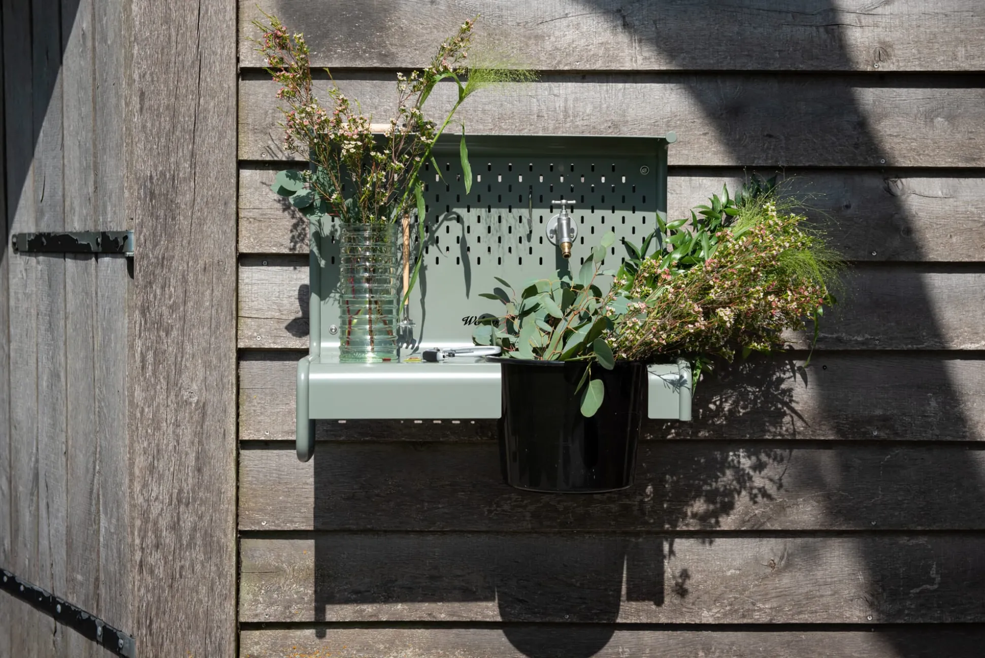 WATERWORKS schafft Ordnung rund um den Wasseranschluss im Garten oder auf dem Balkon und bietet sich als kleine Ablage- und Arbeitsfläche an. Die Lochwand dient mitsamt den mitgelieferten drei S-Haken zum Aufhängen von beispielsweise Werkzeugen, der mitgelieferte Eimer passt formschlüssig in die Aussparung des wetterfest pulverbeschichteten kleinen Wandmöbels. Ein aufgerollter Gartenschlauch (nicht im Lieferumfang enthalten) kann an den seitlichen Rohrenden aufgehängt werden. So ist alles Notwendige immer griffbereit. Zum Lieferumfang gehören neben dem notwendigen Montagematerial ein in das Möbel integrierter Wasserhahn (1/2″). Mithilfe eines Schlauchstücks und des mitgelieferten Gartenschlauchanschlusses (1/2″) wird dieser an einem Wasserhahn angeschlossen, der sich notwendigerweise in der Nähe befinden muss.