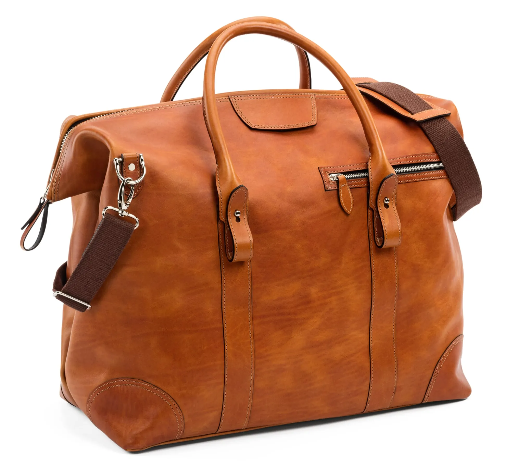 Wie bei den früher in Deutschland gebräuchlichen Arzttaschen sind auch bei unserem Weekender beide Bügel verdeckt gearbeitet (alte italienische Modelle etwa haben außen liegende, sichtbare Metallbügel). Sie ermöglichen einerseits das schnelle Öffnen über die gesamte Breite, andererseits raschen Überblick und Zugriff auf den Inhalt – ein unschlagbarer Vorteil beim Packen und unterwegs, wenn man „aus dem Koffer leben“ muss.