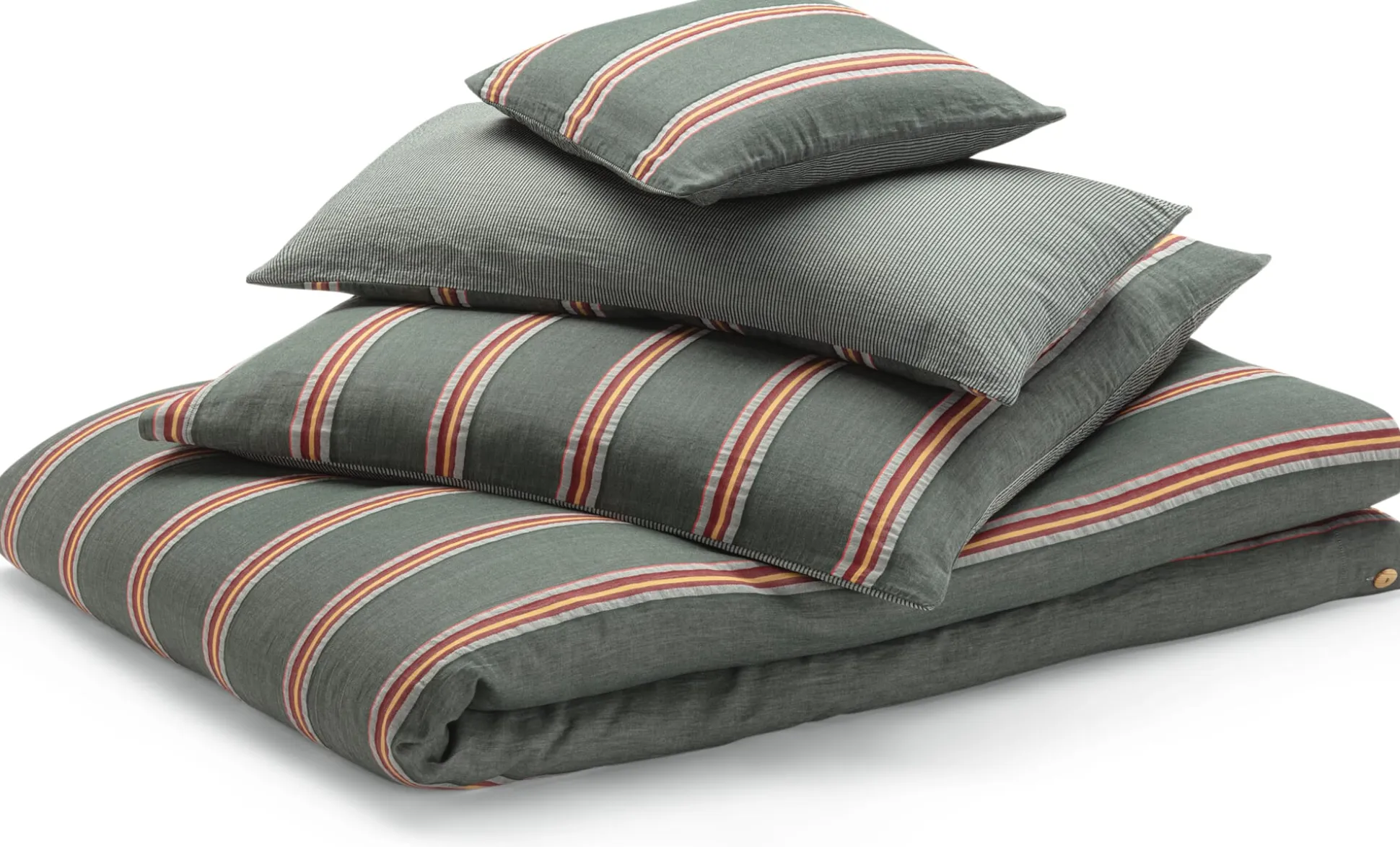Mit dieser Wendebettwäsche können Sie in Ihrem Schlafzimmer im Handumdrehen verschiedene Farbakzente setzen: Denn die eine Seite des Bezugs zeigt feine Streifen in Hell- und Dunkelgrün – es wirkt etwas ruhiger als das Streifenmuster der anderen Seite. Dort verlaufen auf dem dunkelgrünen Fond breite und schmalere Streifen in Bordeauxrot, Gelb, Hellgrün sowie ein feiner, leuchtend roter Kontraststreifen. Das feine, dichte Gewebe aus weicher Baumwolle ist mit einem Flächengewicht von 120 g/qm eher leicht und schmiegt sich gut angenehm an den Körper an. Der Kopfkissenbezug wird mit Holzknöpfen geschlossen.