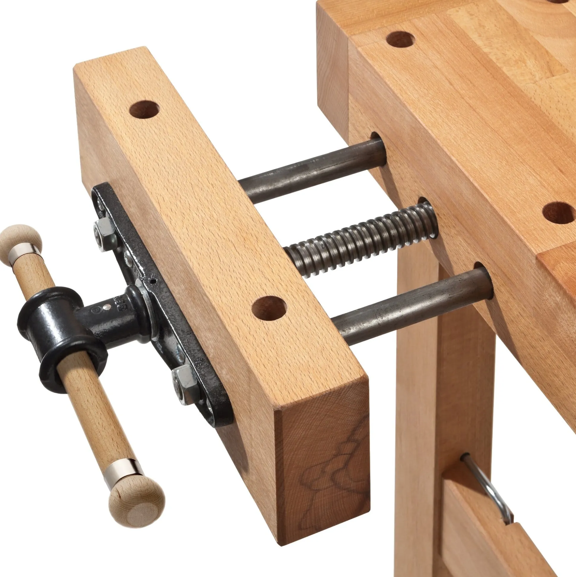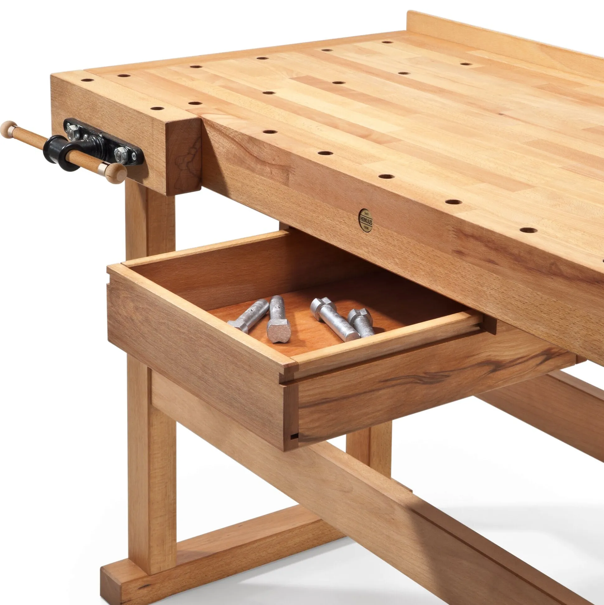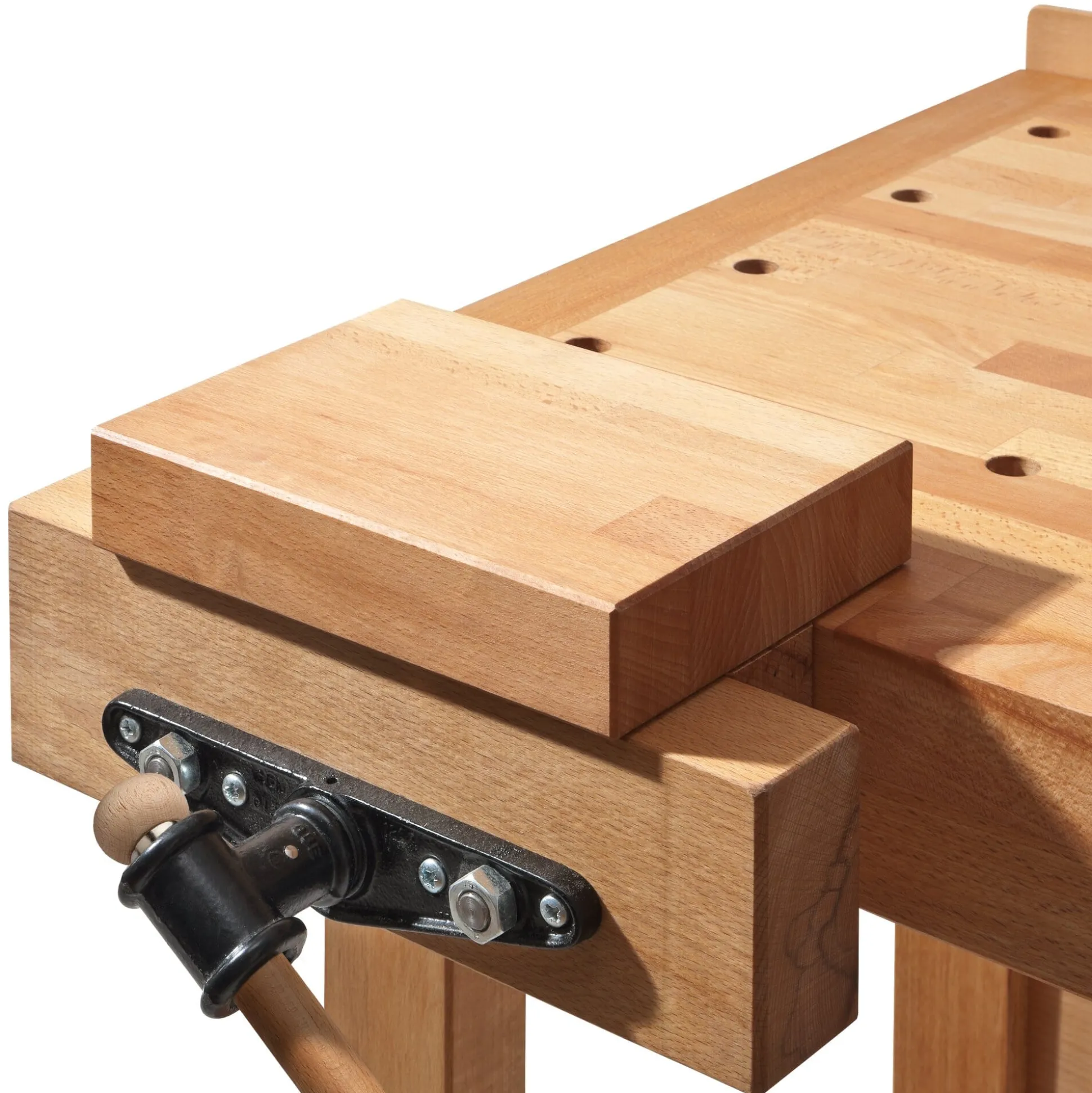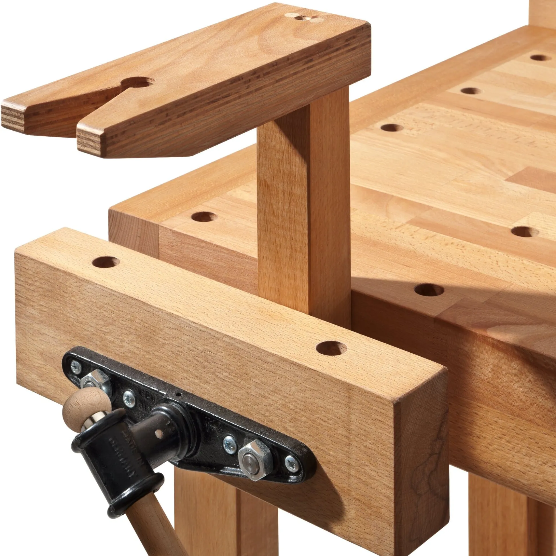 Diese Universal-Werkbank ist von Gewicht, und zwar gleich in zweierlei Sinn. Wichtig, weil die besten Werkzeuge nichts nützen, wenn man die zu bearbeitenden Werkstücke nicht einspannen kann, und gewichtig, weil ihr die Menge des verbauten Massivholzes einen überaus festen Stand verleiht. Für den Gebrauch in Lehrwerkstätten entwickelt, vereint sie die Vorzüge einer klassischen Hobelbank mit denen einer Werkbank – und zwar in einer dem privaten Anwender angemessenen Größe. Der in Niedersachsen ansässige Hersteller – seit 1908 mit Hobel- und Werkbänken befasst – fertigt sie aus gedämpftem, mehrjährig abgelagertem und anschließend kammergetrocknetem Rotbuchenholz aus heimischen Forsten. Die Arbeitsplatte der Werkbank ist, wie bei Hobelbänken üblich, aufgesetzt und ruht auf stabilen Holzdübeln. Die einzelnen Lamellen der 5 cm starken Hobelbankplatte sind stirnseitig durch Keilzinken verbunden und mit Leinölfirnis imprägniert. Die beiden vorn und seitlich angebrachten Spannzangen laufen über je zwei Führungsstangen aus Stahl (Ø 20 mm). Angezogen werden sie über eine Trapezgewindespindel (Ø 25 mm), die unterhalb der Führungsstangen verläuft. Dadurch können Werkstücke beim Einspannen beschädigungsfrei auf diese aufgelegt werden. Hinter der vorderen Spannzange ist die Werkbank mit einer doppelten Lochreihe ausgestattet. Über diese können Werkstücke zwischen den mitgelieferten Bankhaken an vier Punkten eingespannt werden. Das ebenfalls zum Lieferumfang gehörende Verlängerungsstück – das bei Bedarf in der Vorderzange eingespannt wird – erlaubt das Bearbeiten von bis zu 2,2 m langen Werkstücken. Ein Schubkasten unter der Arbeitsplatte der Werkbank nimmt Zubehörteile (wie die Bankhaken) auf.