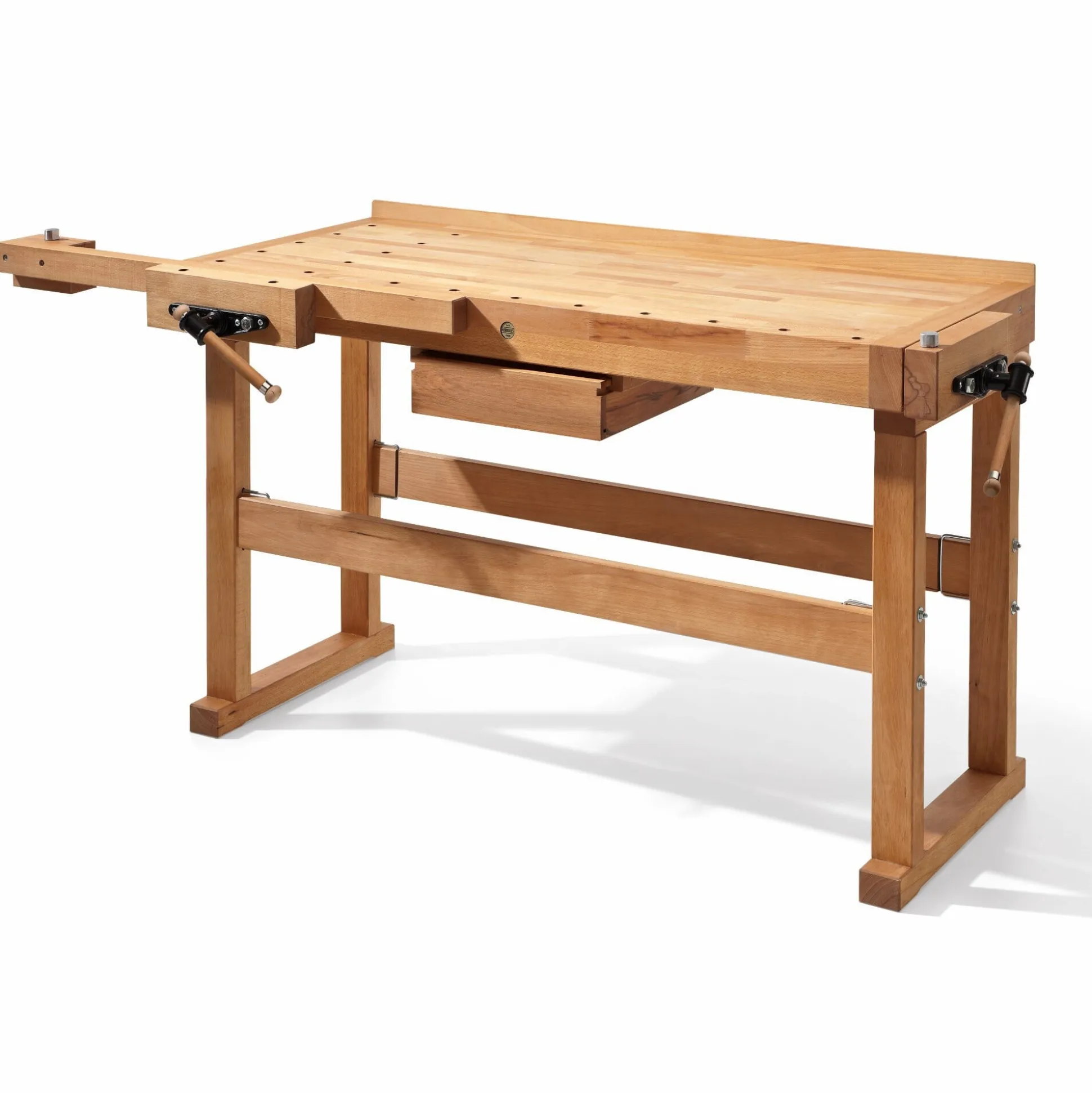 Buchenholz massiv. Arbeitshöhe 90 cm, Arbeitsfläche 150 x 65 cm. Stärke der Vorder- und Hinterzange jeweils 5,5 cm. Verlängerungsstück (Länge 1,05 m), 4 Bankhaken aus Aluminium und ein Schubkasten (H 10 x B 40 x T 46 cm) aus Buchenholz. Gewicht 86 kg.