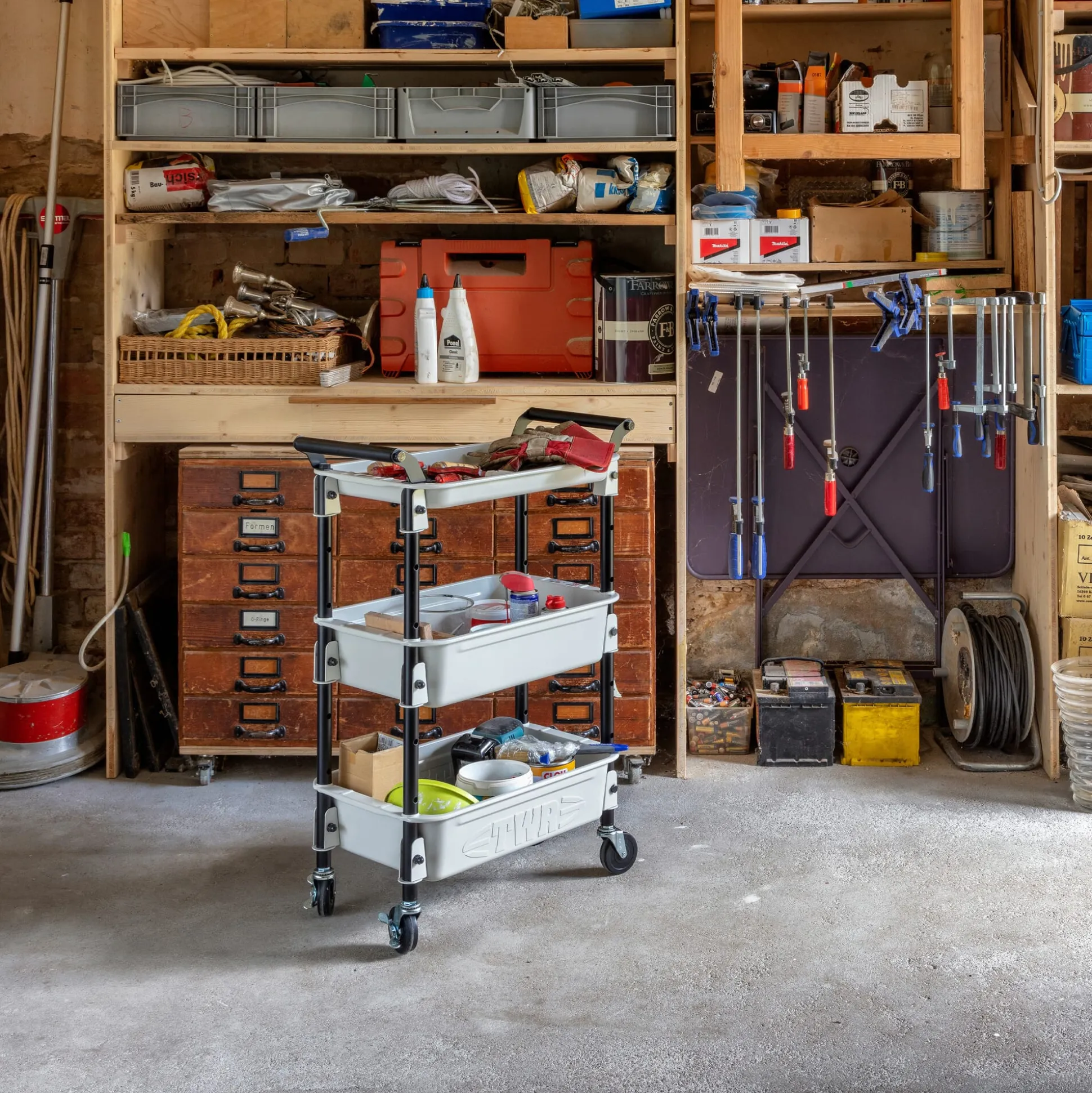 Dieser robuste Rollwagen aus einer kompletten Konstruktion aus Stahl wurde für die Werkstatt gemacht und trägt zuverlässig bis zu 80 kg. Seine Machart, der überzeugende Materialeinsatz sowie die ablesbare Qualität unterscheiden ihn von vordergründig vergleichbaren Produkten am Markt. Er eignet sich für die vielfältige Nutzung in Küche, Wohnraum, Bad oder Büro. Die drei tiefgezogenen Stahlblechwannen sind robust und in zwei unterschiedlichen Bauhöhen verfügbar. An den senkrechten Rundholmen können sie in der Reihenfolge frei positioniert und in der Einsatzhöhe verstellt werden. Vier drehbare Gummirollen – davon zwei mit je einer Bremse ausgestattet – sorgen für gute Manövrierfähigkeit. Der Wagen kommt als Bausatz und ist leicht zu montieren.