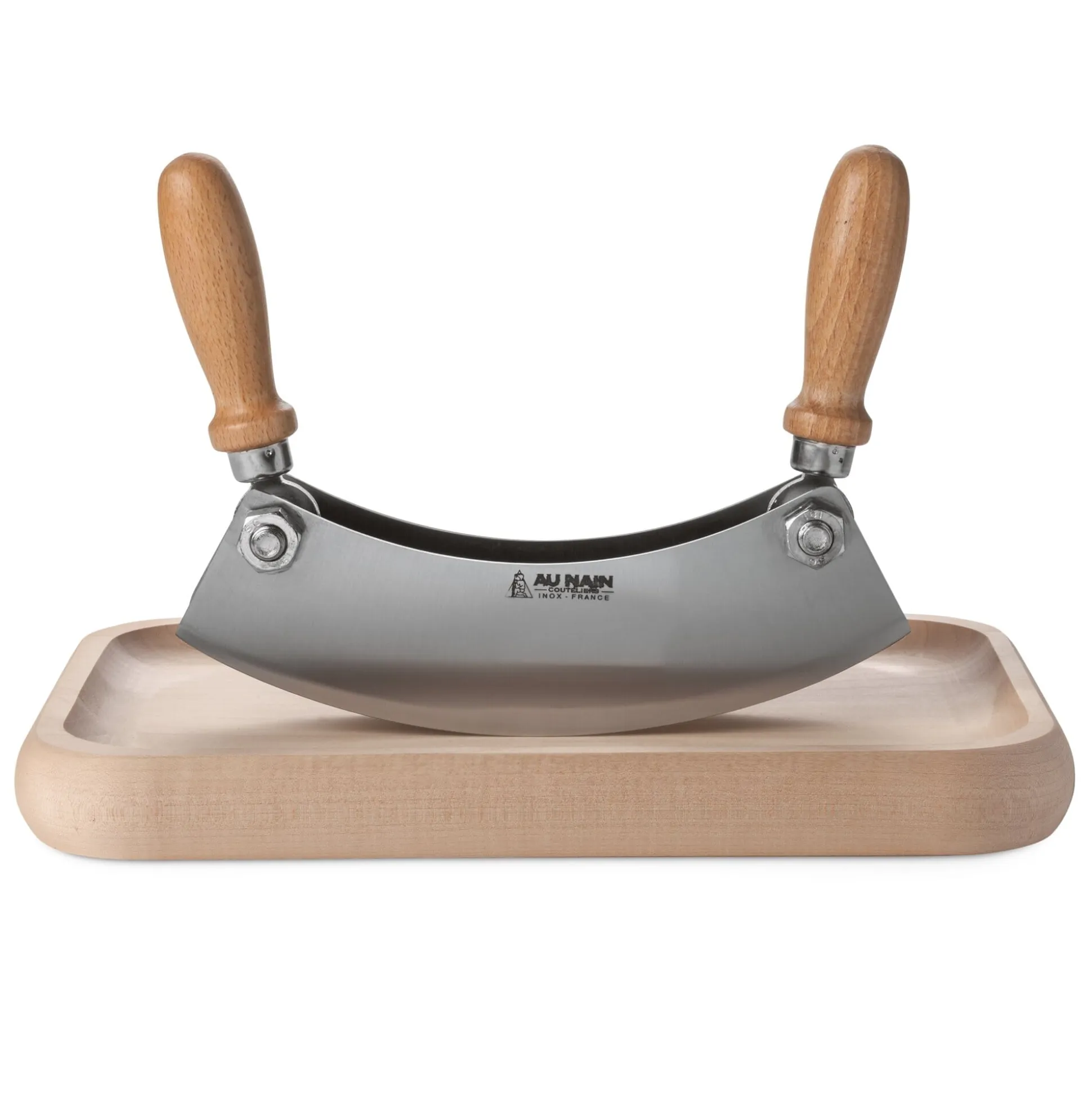 Seit 1895 werden bei Au Nain in Saint-Remy-Sur-Durolle, nahe Thiers, Messer für den professionellen Bedarf von Köchen und Metzgern hergestellt. Qualität und Zeckmäßigkeit sind in dem Familienunternehmen seit je her die leitenden Maßstäbe. Das Wiegemesser von Au Nain ist daher nicht nur hochscharf, sondern besitzt winkelverstellbare Handgriffe, die man an die eigenen ergonomischen Bedürfnisse anpassen kann. So können Kräuter, Nüsse, Schokolade etc. mit der entsprechenden Dynamik in der Wiegebewegung schnell und leicht zerkleinert werden. Ein Brett mit Mulde erleicht die Verabeitung zusätzlich.