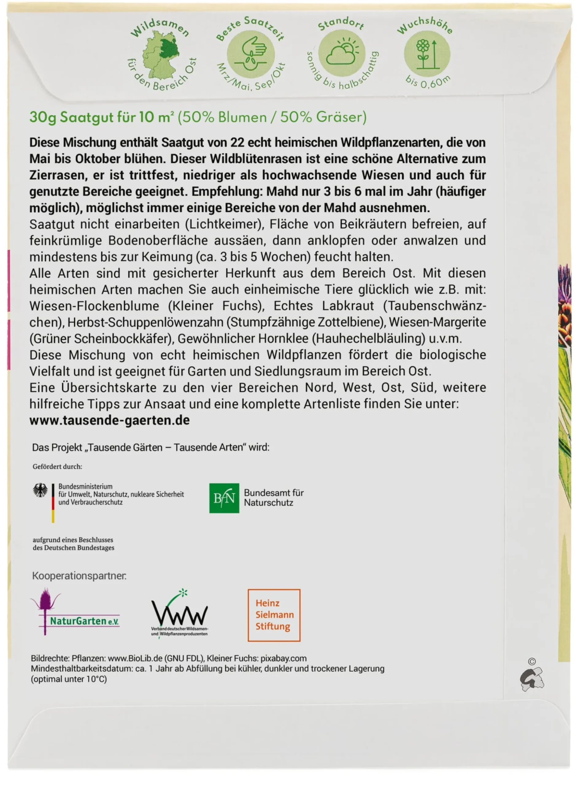 Für einen blühenden Rasen: 30 g Saatgut von Wildblumen (50%) und Gräsern (50%). Enthalten sind je nach Region etwa 18 bis 32 echt heimische Wildpflanzenarten. Mit den ersten Blüten ist im zweiten Jahr nach der Aussaat zu rechnen, die Blütezeit erstreckt sich von Mai bis Oktober. Ausreichend für eine Fläche von 10 qm. Aussaat- und Pflegeanleitung auf der Verpackung.