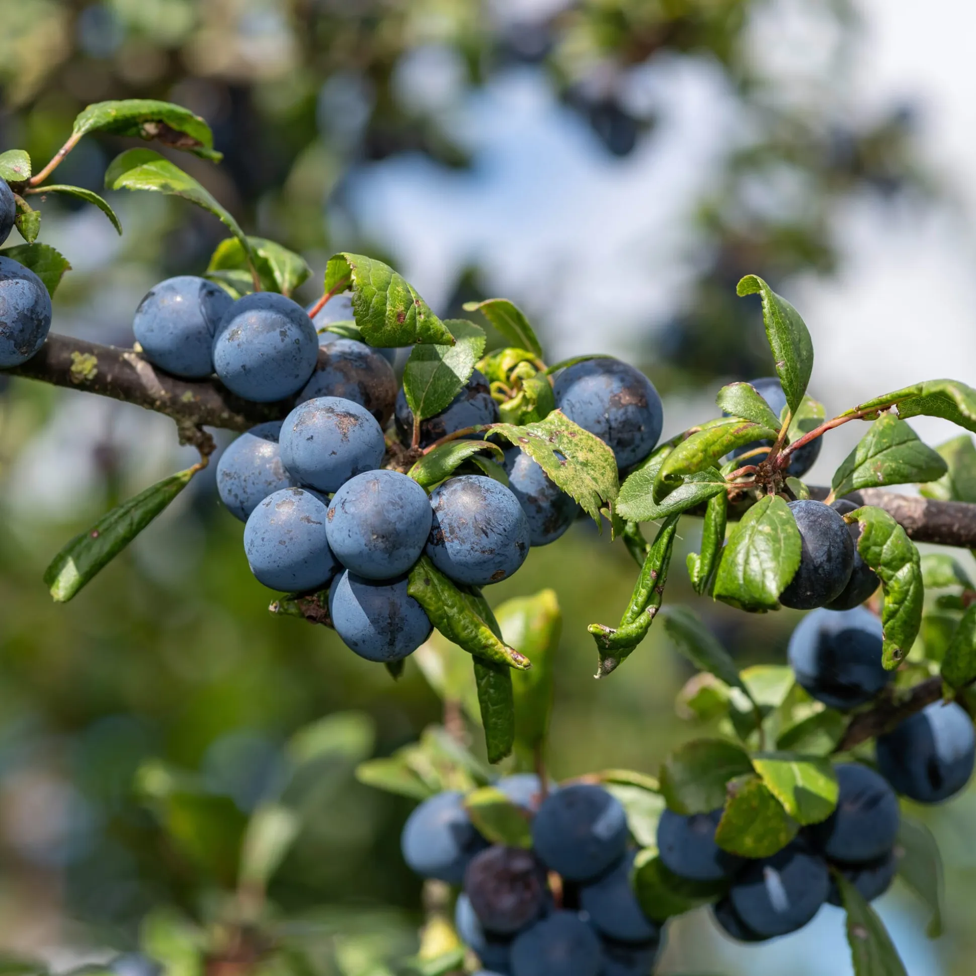 Fast sauerkirschgroß, blau, leicht bereift. Aufgrund geringerer Gerbstoffgehalte fruchtig-aromatisch, weniger herb und süßer als die wilde Schlehe. Schon ab September, also vor Frosteinwirkung essbar. Für Saft, Likör, Marmelade oder den Direktverzehr.