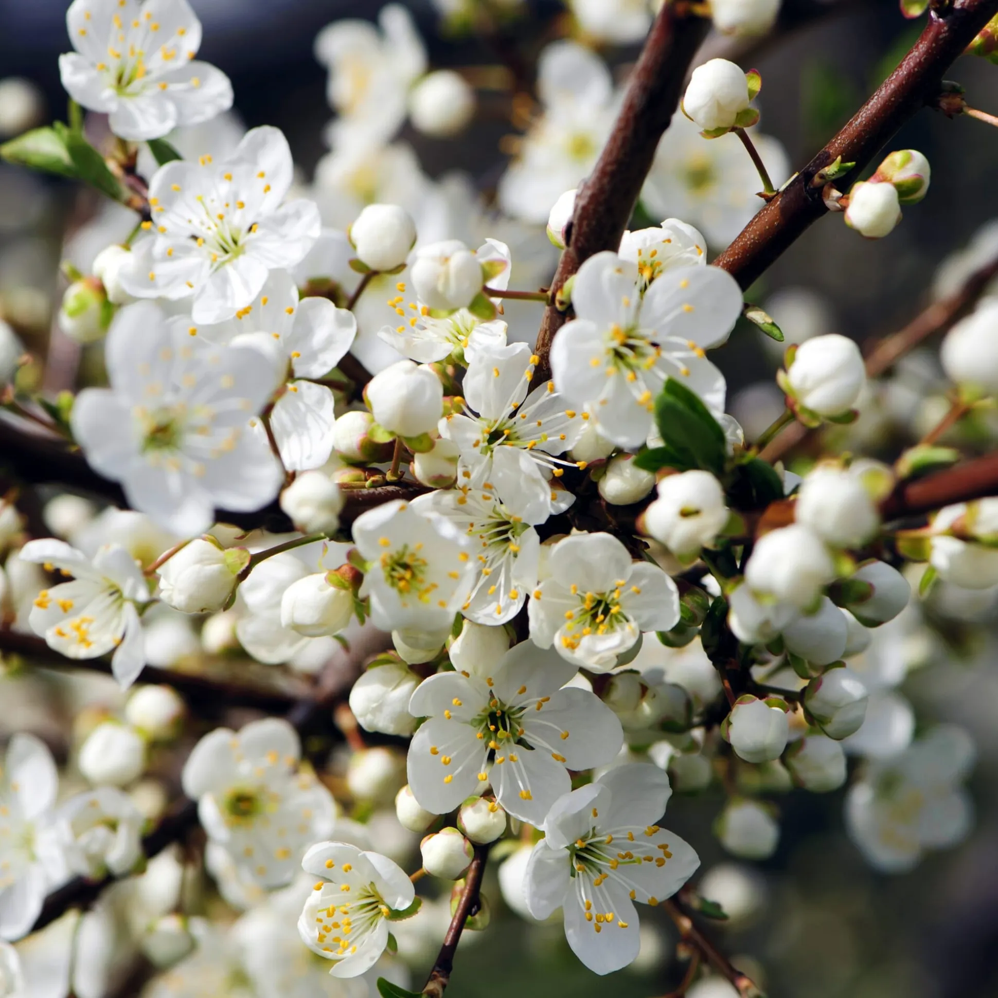 Auf Pflaume veredelt. Wächst nicht strauchartig, sondern zu einem kleinen, etwa 3 m hohen und breiten Baum heran. Prächtiger weißer Blütenflor im April. Die Pflanze ist selbstfruchtbar und bildet keine Ausläufer.