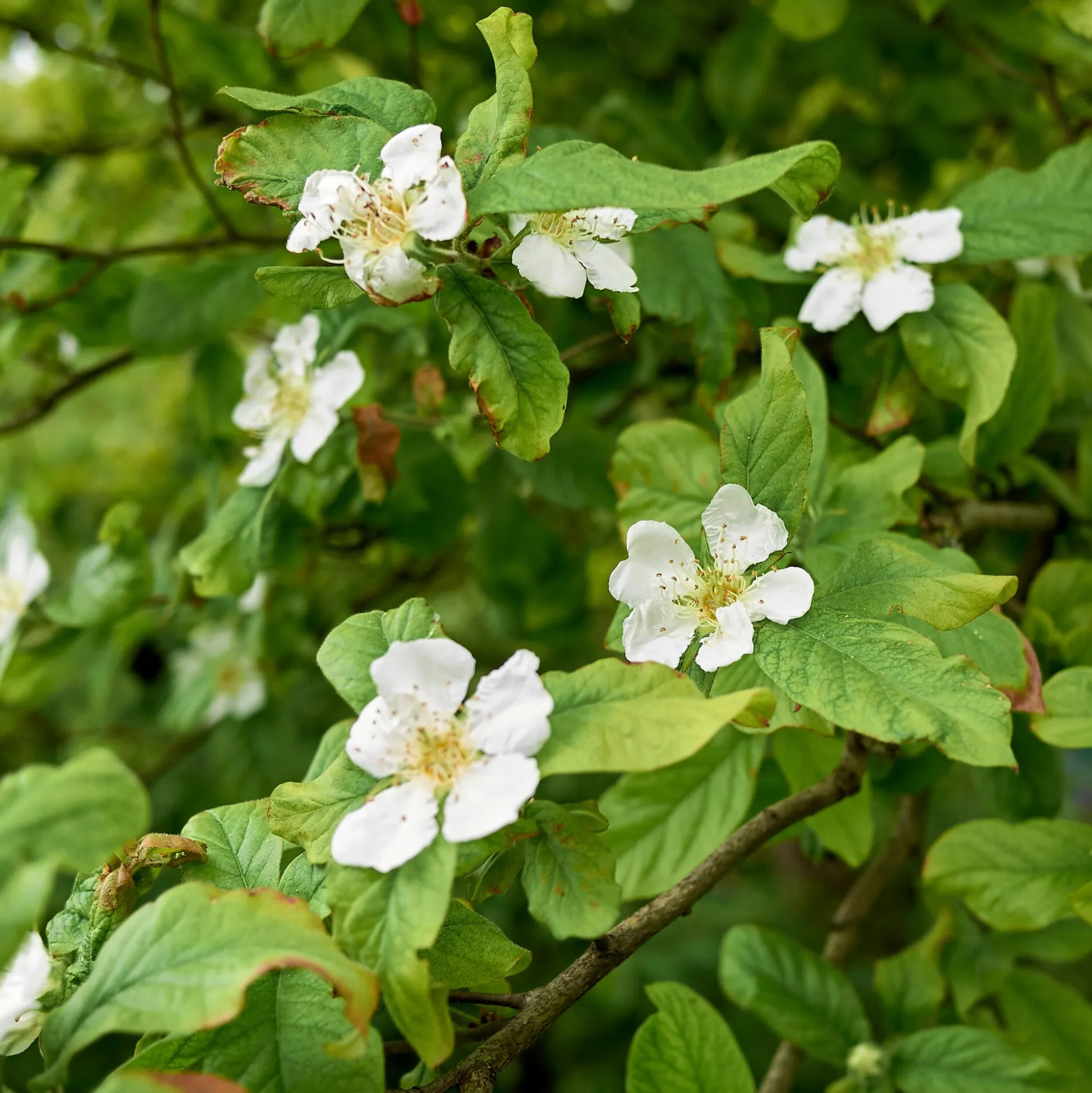 Bis zu 6 m hoher, oft mehrstämmiger Strauch oder kleiner Baum, im Alter 3–5 m breit. Triebe und junge Zweige zottig-filzig behaart, oliv- oder rotbraun. Sehr attraktive weiße Blüten ab Ende Mai. Die Pflanze ist selbstfruchtbar.