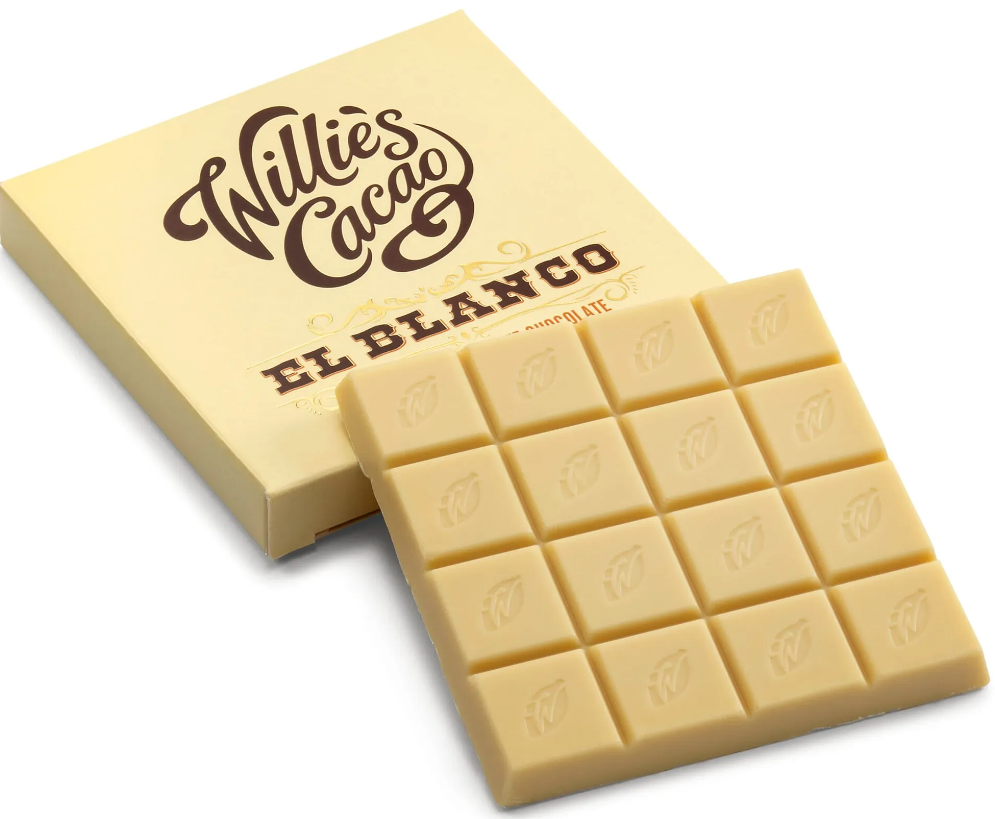 Eine weiße Schokolade wie diese ist selten. Sie besteht nur aus Kakaobutter, rohem Rohrzucker und Milch – auf den sonst oft üblichen Zusatz von Vanille verzichtet Willie Harcourt-Cooze ganz bewusst. Die wunderbar cremige, milde und nicht zu süße Schokolade benötigt ihn auch nicht: Sie ist schon von sich aus aromatisch und ein echter Hochgenuss.