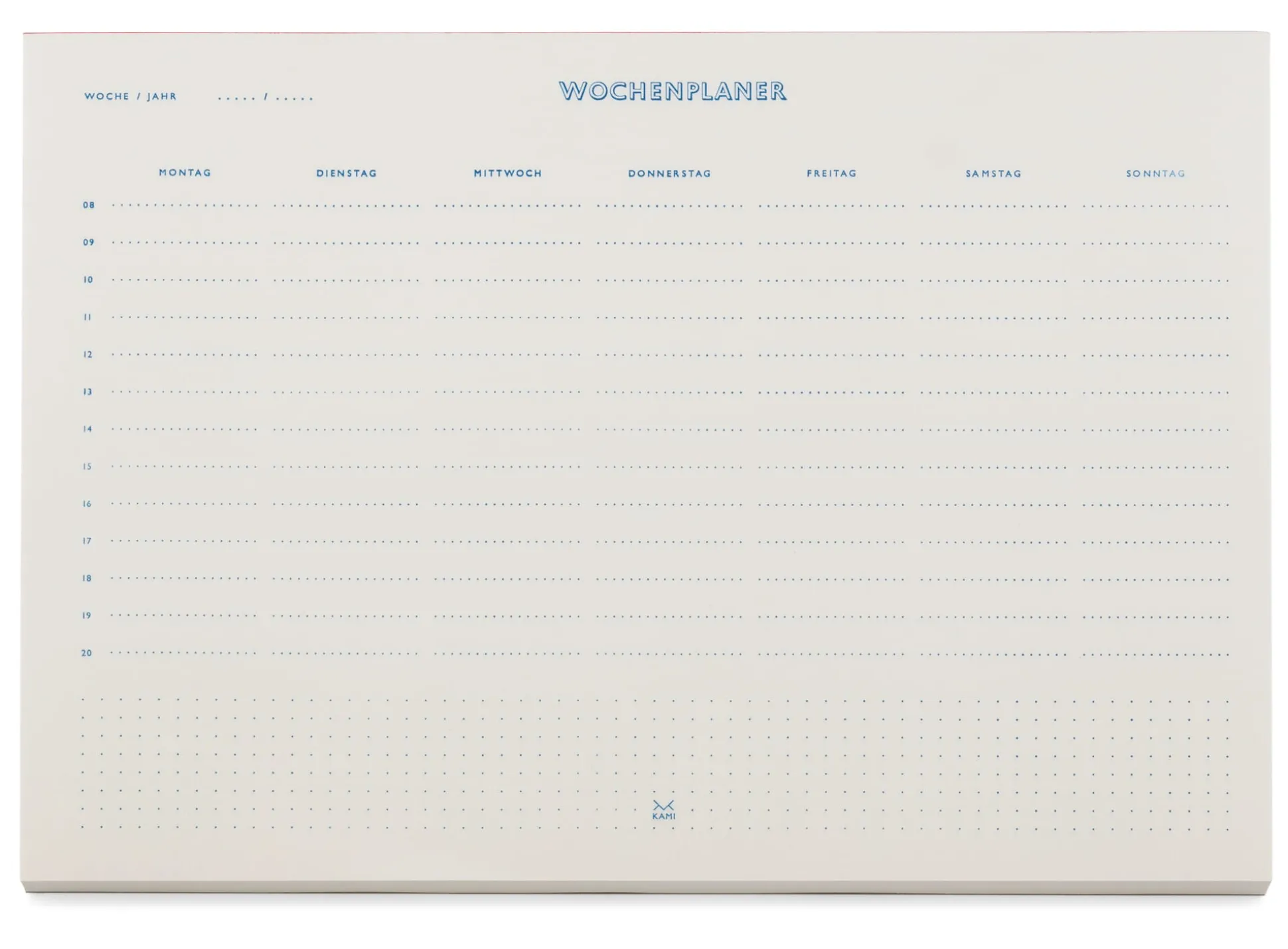 Mit blauer Tinte auf historischer Maschine gedruckt und neonrot gummiert geklebt: KAMI ist übersichtlicher Planer für die 52 Wochen des Jahres.