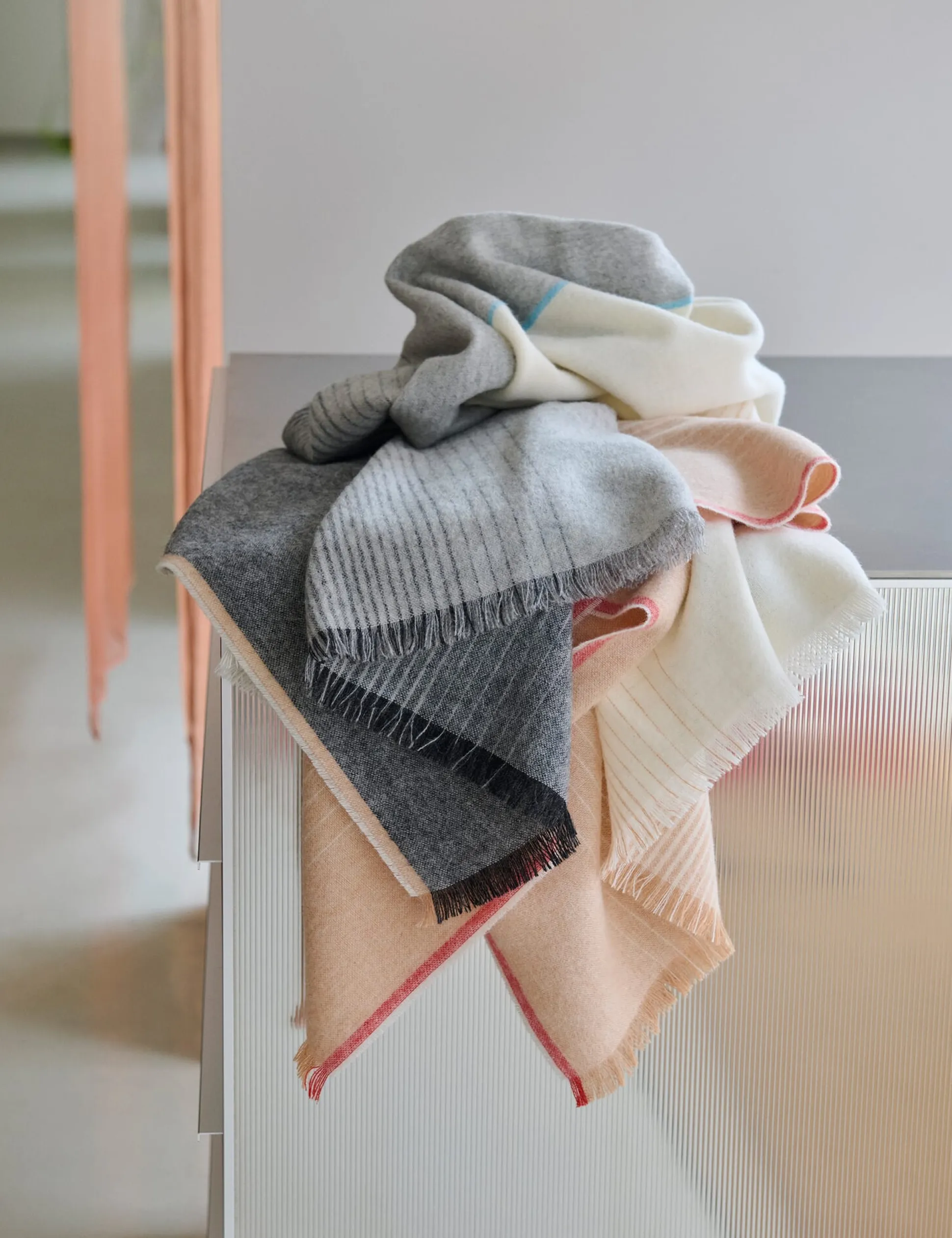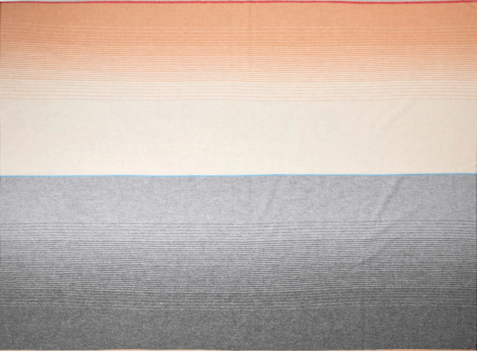 Schlicht und geradlinig ist das grafische Muster mit seinen kontrastierenden Farben, die bei dieser weichen Alpakadecke für Spannung sorgen. So sanft die gewebten Farbverläufe der beiden Farbflächen sind, so unmittelbar treffen sie in der Mitte der Decke aufeinander – wie Erde und Himmel am Horizont. Zwei Bilder, die den Horizont zeigen, waren es auch, die die französische Designerin Inga Sempé zu diesem Entwurf inspirierten. Die Farben wählte sie passend zu den abstrahierten Landschaftsmotiven aus: warme Rot-, Orange- und Grautöne für die Erde, Blau und Rosa für das Wasser. Sempé selbst nennt ihre Kollektion „Carte Postale“, weil die Motive sie an alte Urlaubspostkarten erinnern.