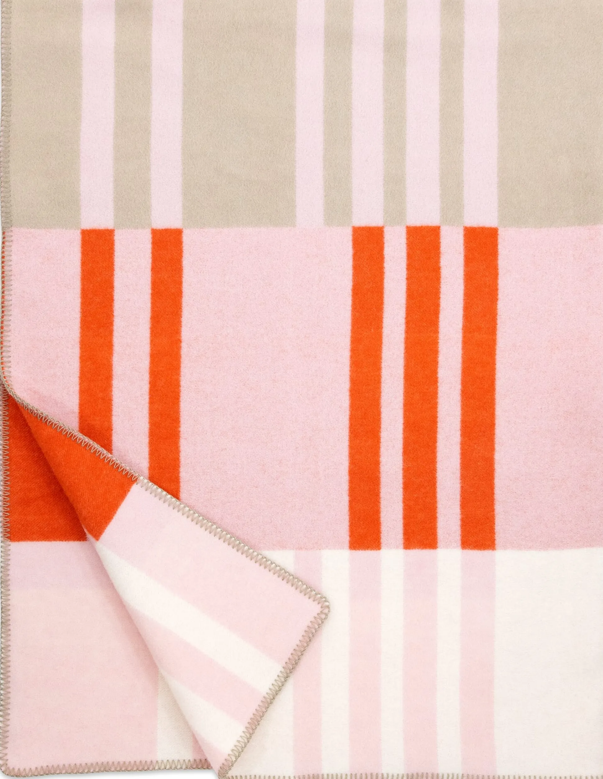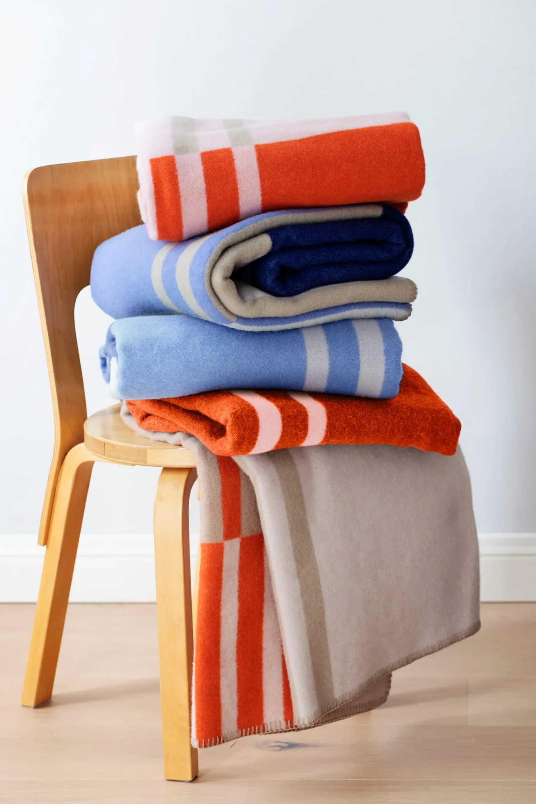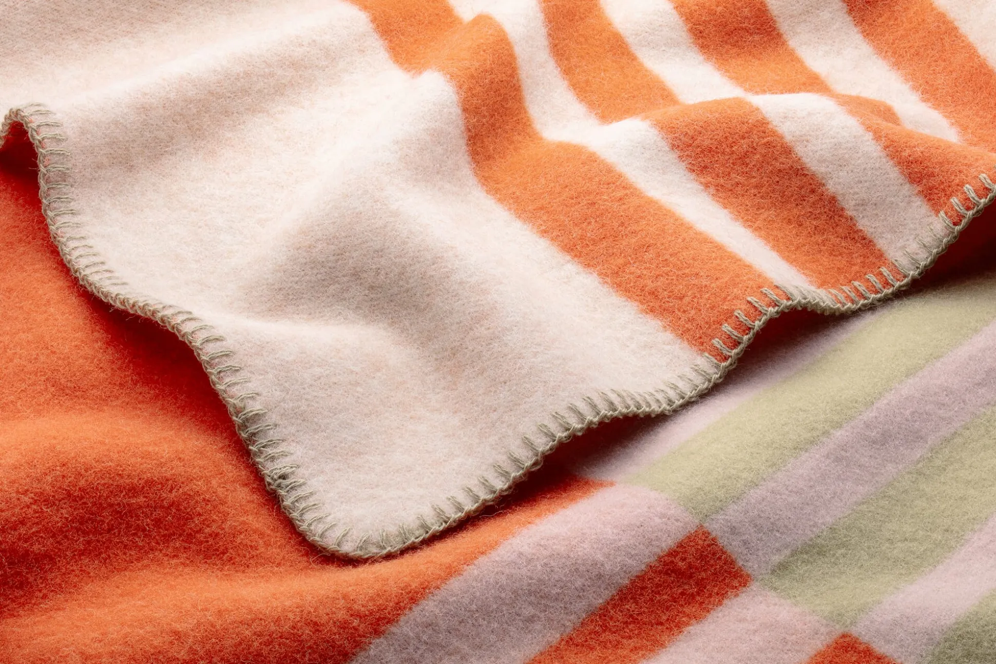 Weiche Wolldecke mit Volumen in kräftigen, karamelligen Farbkombinationen und linearem Blockmuster, das auf der Rückseite invers erscheint. Die Kettelnaht stabilisiert die Ränder und steht in schönem Kontrast zum gewählten Farbton. Ideal zum Einwickeln auf dem Sofa oder dem Sessel, auch als zweite Bettdecke geeignet.