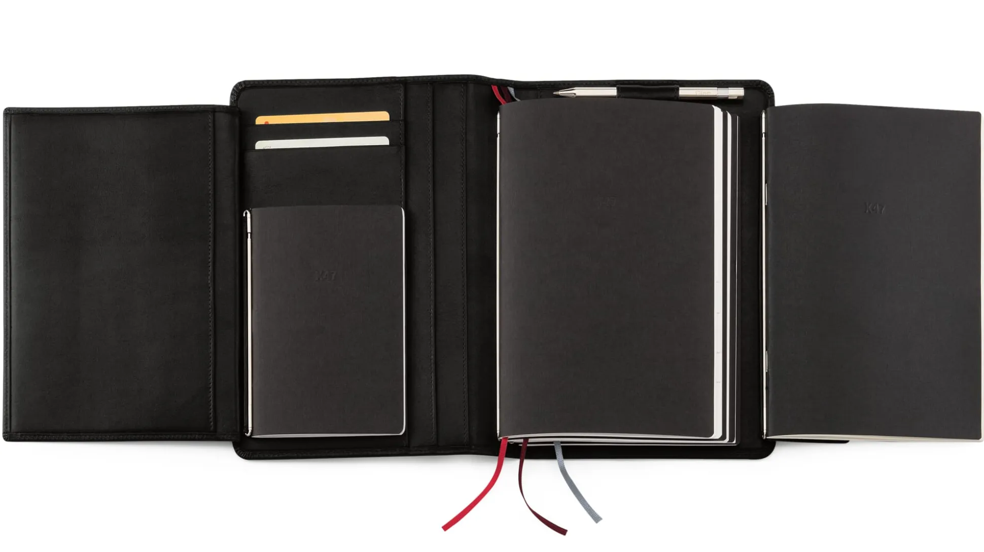 Das X47-Organisationssystem des ehemaligen Unternehmensberaters Matthias Büttner ist ganz handgreiflich aus der termingefüllten und kontaktfreudigen Berufspraxis Büttners entstanden und schnell zu einem durchdachten System von Möglichkeiten und Kombinationen gewachsen. Termine, Adressen, Notizen etc. finden in einzelnen Heften Platz, die mittels einer Stange in Federschienen im Rückenfalz der ledernen Hülle befestigt werden können.