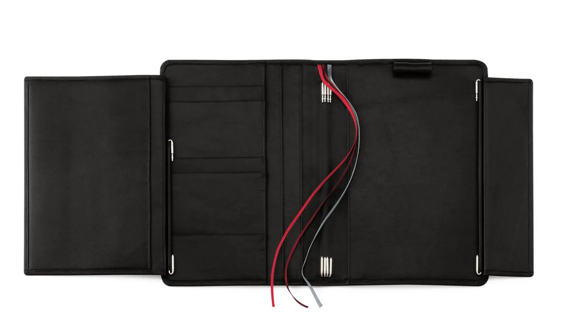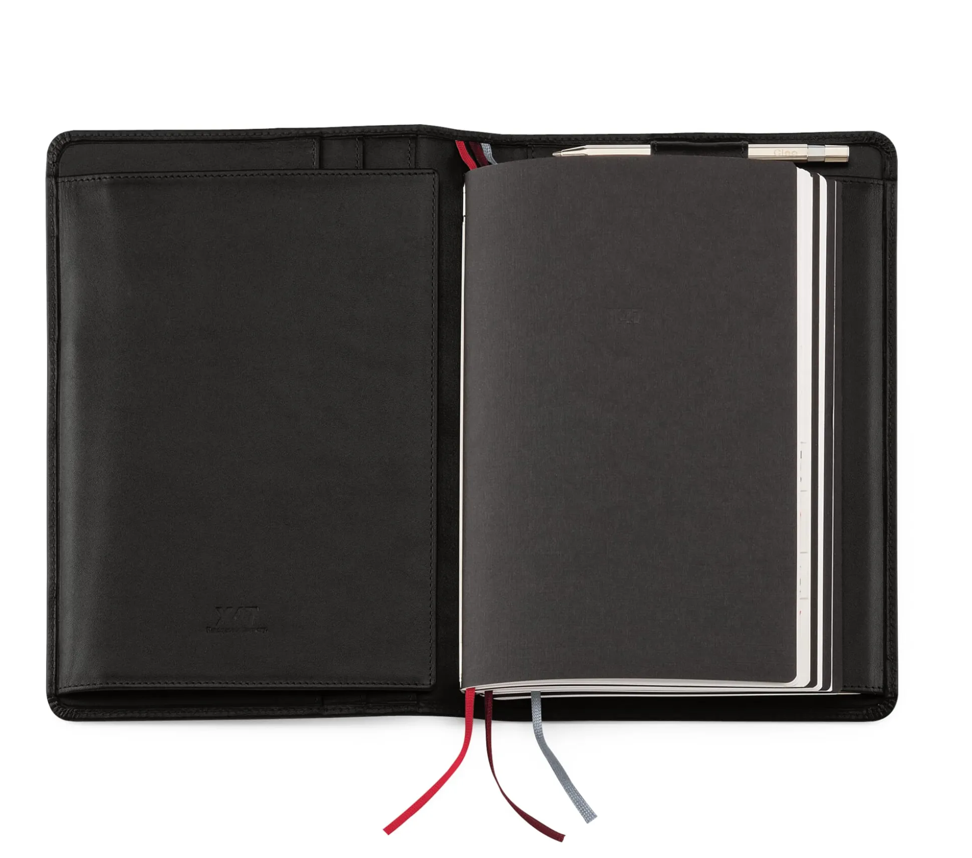 Für 5 Einlagen des Formats A5 (mittig und rechts) und eine des Formats A6 (links). Aus feintäschnerisch verarbeitetem Rindleder. Mit 4 Einsteckfächern für A5- bzw. einmal gefaltete A4-Formate, einem etwas kleineren Einsteckfach, 5 Taschen für Kredit-, Dauer- und Visitenkarten, mit 3 Zeichenbändern in unterschiedlichen Farben und einer Stiftschlaufe für schlanke Schreibgeräte bis zu einer Länge von 15 cm.