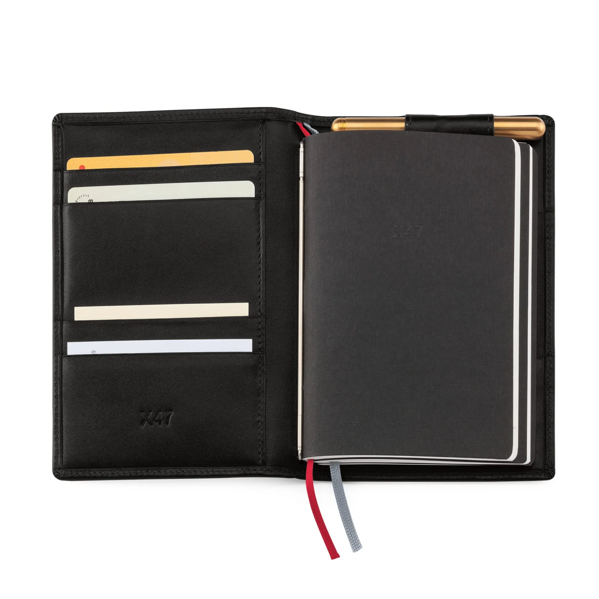 Dieses X47-Organisationssystem fasst lediglich drei A6-Einlagen und bleibt somit nicht nur wegen des kleinen Formats jackentaschentauglich, sondern auch im Umfang schlank. Ansonsten ist es wie die größeren Varianten aus feinem Rindleder gearbeitet. In zwei Steckfächern lassen sich Notizzettel unterbringen, fünf kleinere Fächer nehmen Kreditkarten auf. Zwei verschiedenfarbige Zeichenbänder dienen als Lesezeichen und eine Schlaufe nimmt einen schlanken Stift bis 10 cm Länge auf.