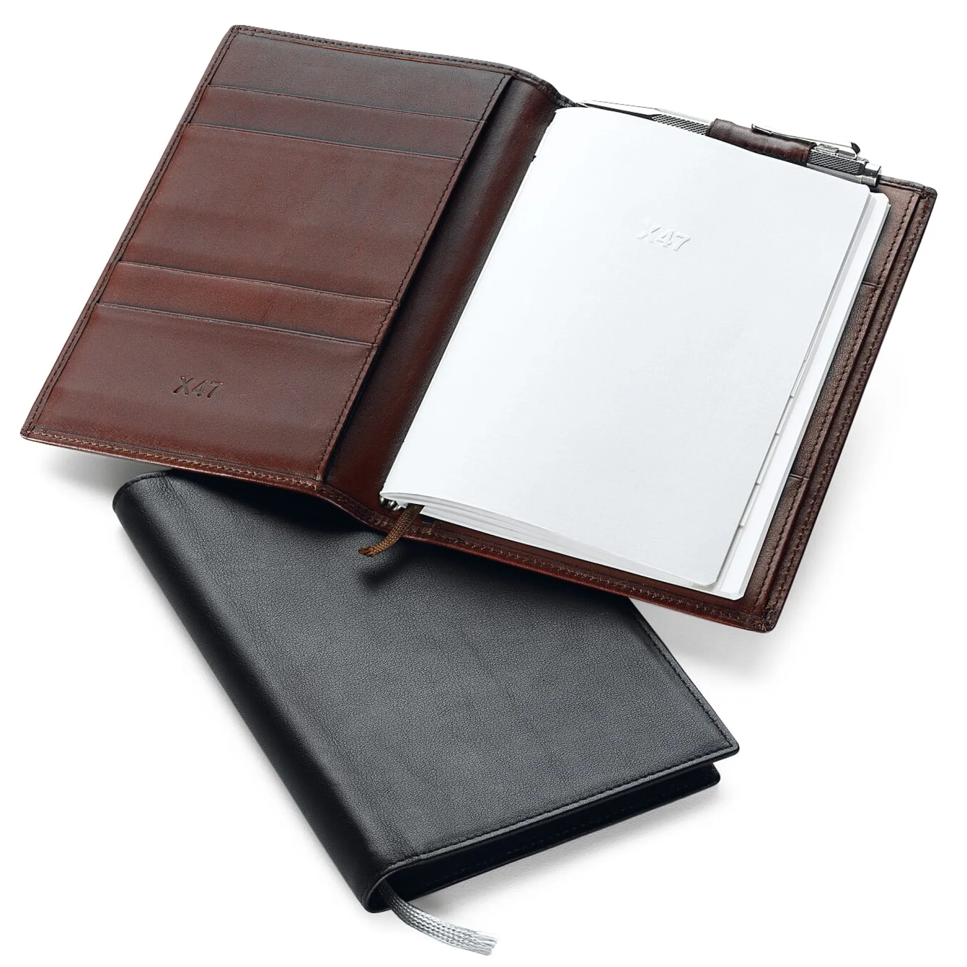 Das X47-Organisationssystem des ehemaligen Unternehmensberaters Matthias Büttner ist ganz handgreiflich aus der termingefüllten und kontaktfreudigen Berufspraxis Büttners entstanden und schnell zu einem durchdachten System von Möglichkeiten und Kombinationen gewachsen. Termine, Adressen, Notizen etc. finden in einzelnen Heften Platz, die mittels einer Stange in Federschienen im Rückenfalz der ledernen Hülle befestigt werden können.
