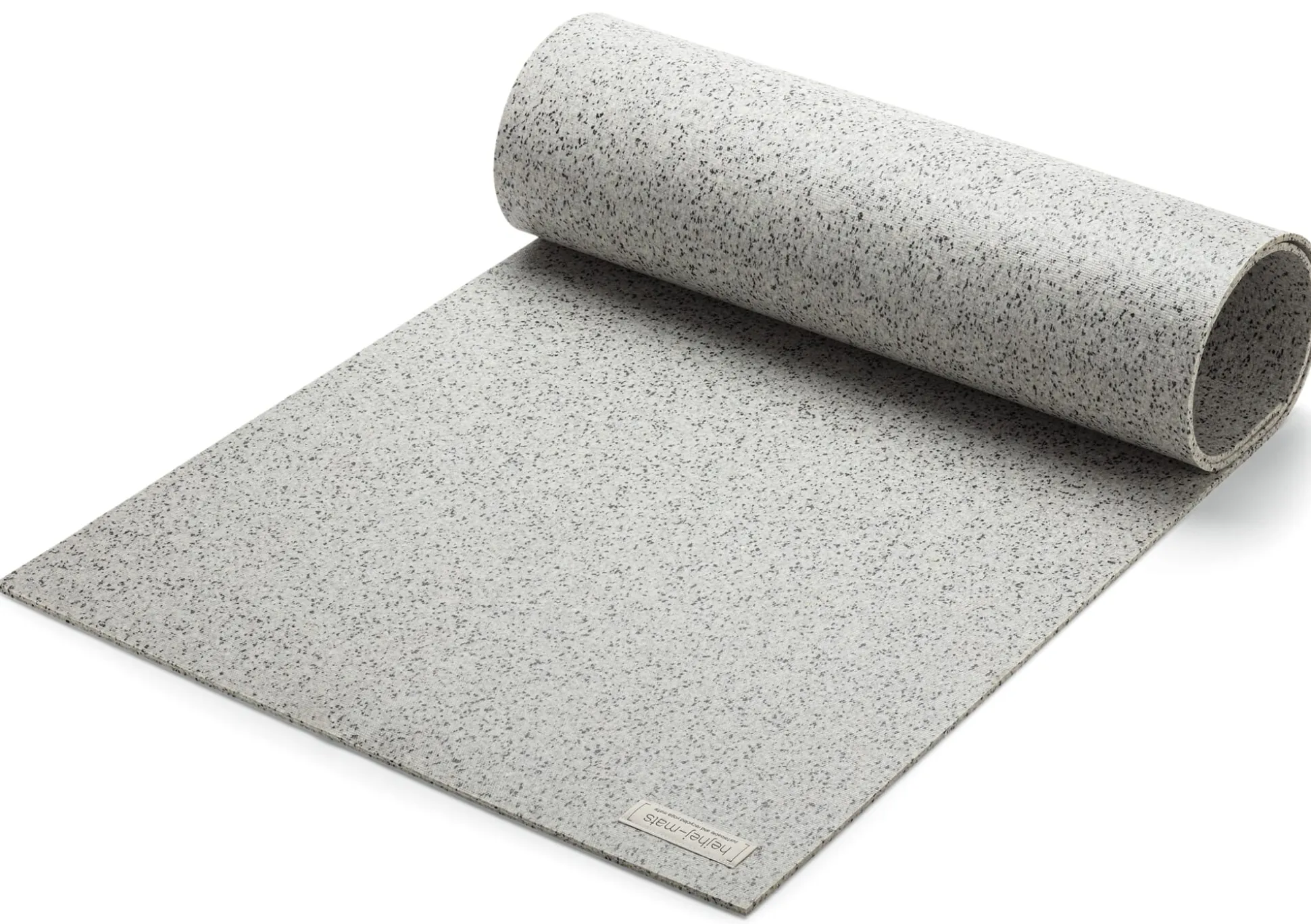 Das Prinzip des „closed-loop“, des geschlossenen Materialkreislaufs, war bei der Entwicklung dieser Yogamatte das wichtigste Kriterium: Sie besteht aus Sekundärrohstoffen und kann recycelt werden. Für die Produktion werden Schnittreste aus der Schaumstoffindustrie verwendet, die insbesondere bei der Matratzenproduktion in großen Mengen anfallen. Lediglich das dünne Trägergewebe in der Mitte, die Beschichtung sowie das Baumwollband und das Logo (aus Hanf) werden für die Yogamatte neu produziert.