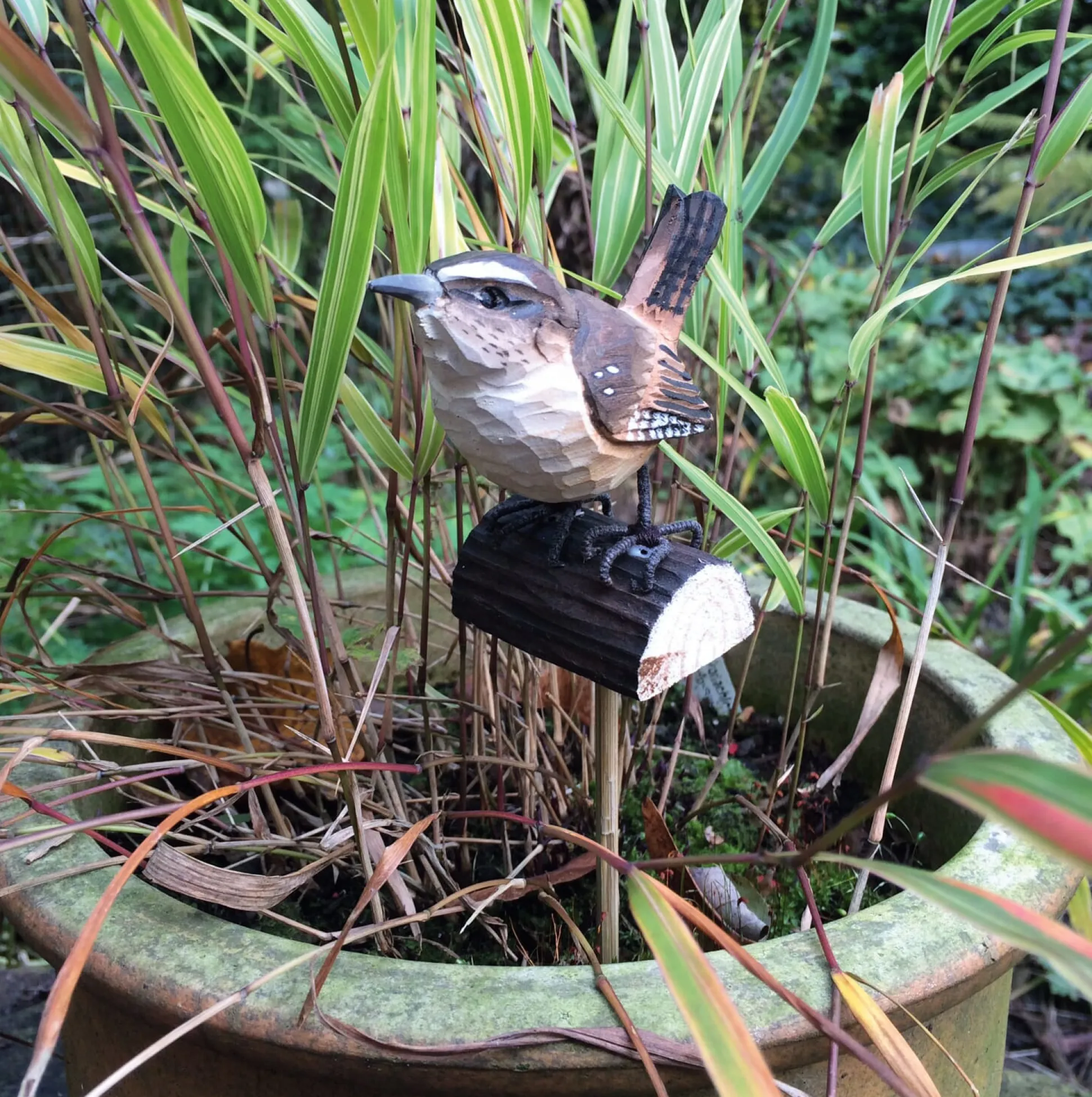 Lindenholz handbemalt. Füße aus ummanteltem Stahldraht.