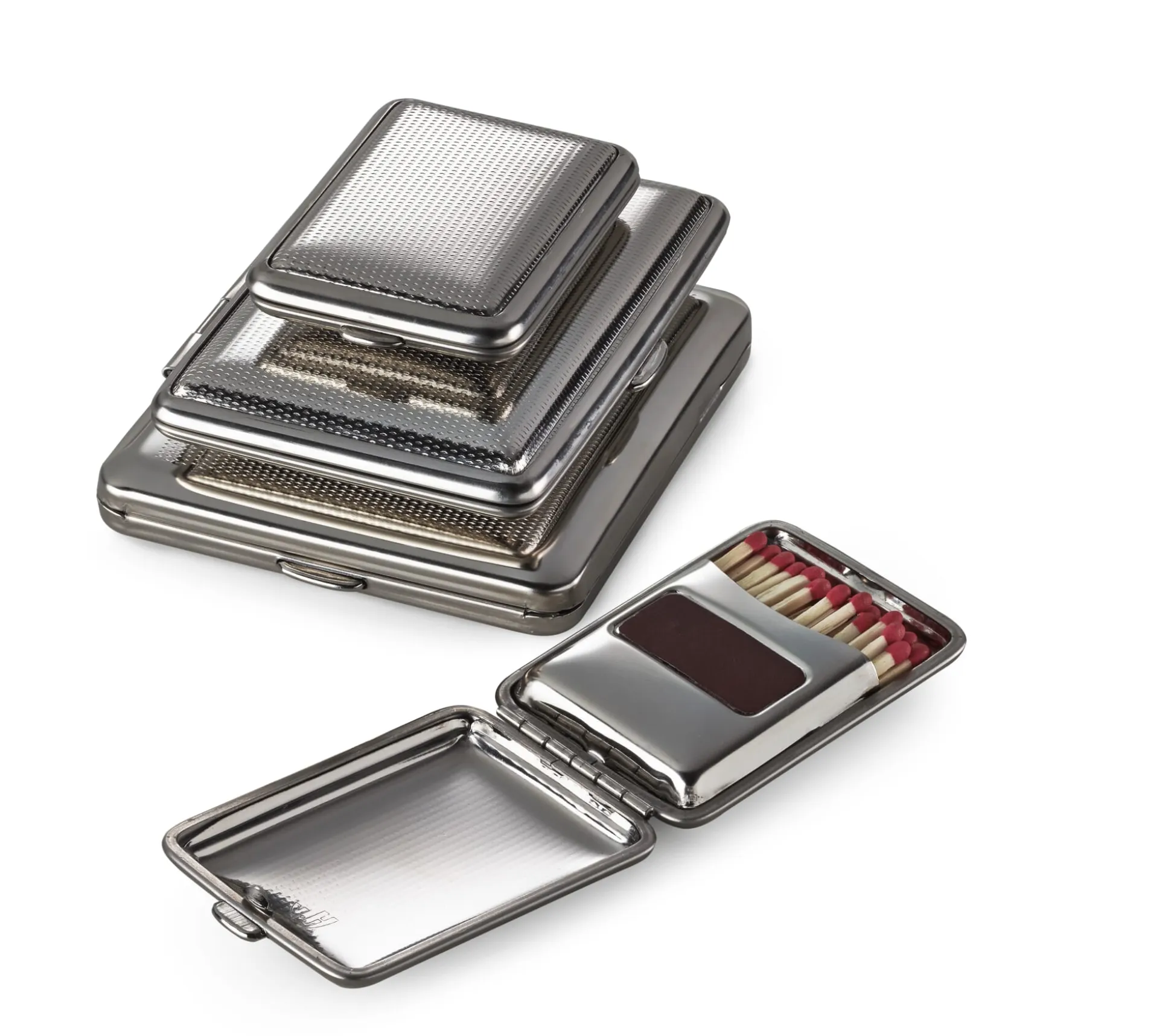 Das Tiefziehen ist ein industrielles Massenproduktionsverfahren – fachlich dem sogenannten Zugdruckumformen zugehörig –, das die kostengünstige Reproduktion von Metallbauteilen und damit die Herstellung hochwertiger, aber nicht hochpreisiger Produkte ermöglicht. In Deutschland ist das Tiefziehen von Konsumgütern dennoch selten geworden, jedoch nicht aus Gründen der Qualität, sondern des verschärften globalen Wettbewerbs. Von einem der wenigen verbliebenen deutschen Hersteller stammen unsere tiefgezogenen Etuis aus hochglänzend vernickeltem Stahlblech, das dank seiner Robustheit – harte Schale, geschützter Kern – hochgeschätzt wird. Boden und Deckel sind mit unterschiedlichen Dekoren geprägt: mit Punktdekor, mit floralem Muster oder mit einem Streifendekor und Gravurfeld.